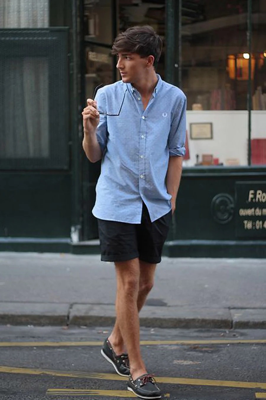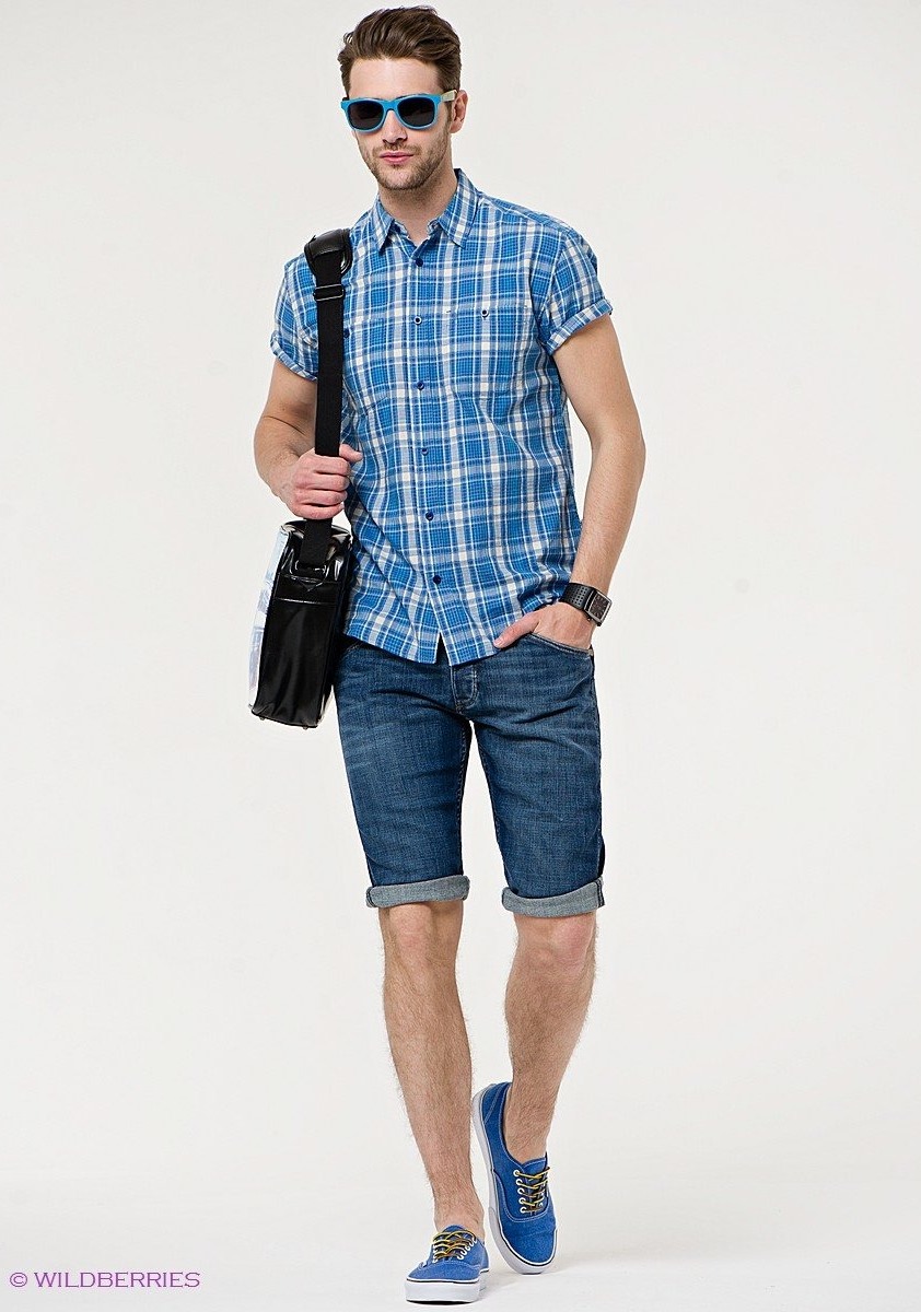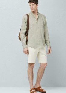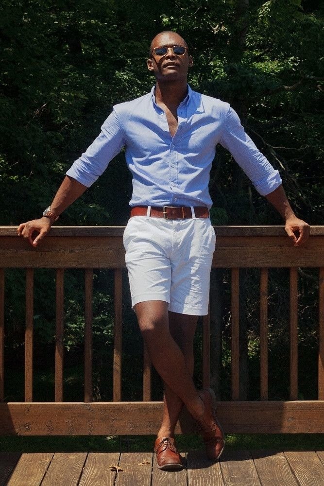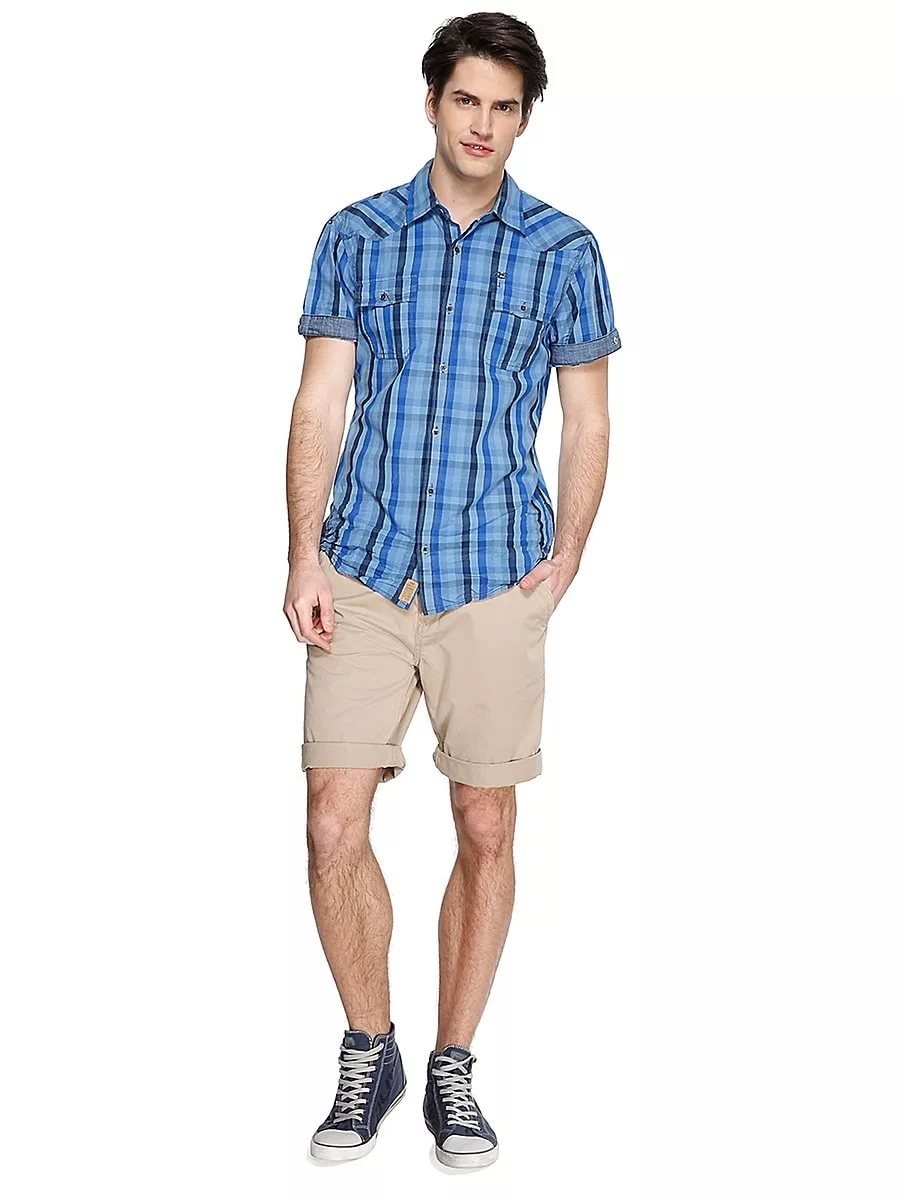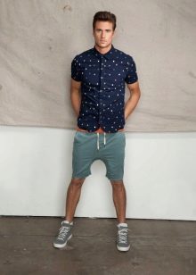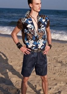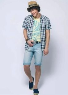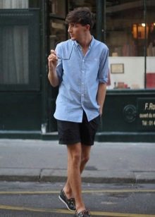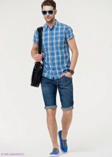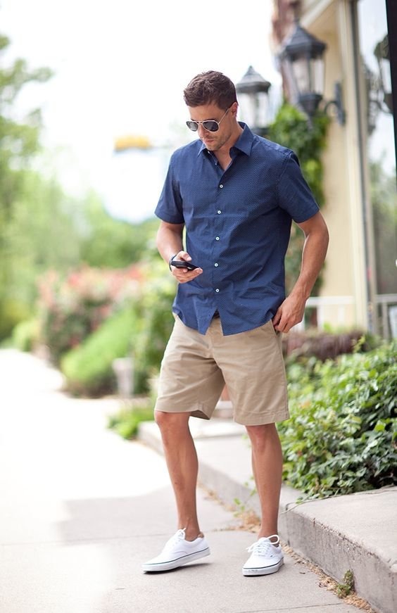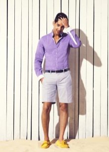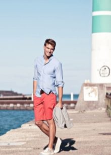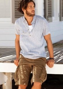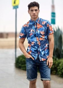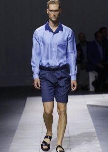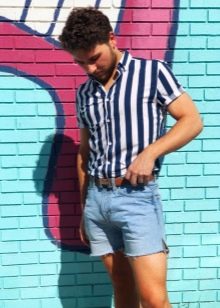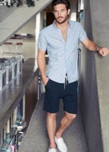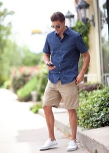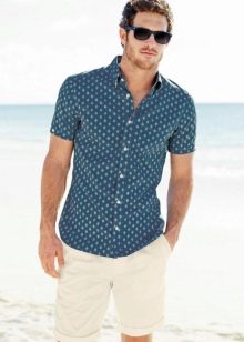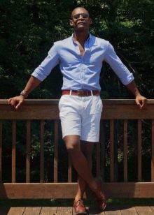 Nicht weniger oft tragen Männer im Sommer blaue Hemden. Die besten Kombinationen werden mit weißen, beige, grauen Shorts erzielt.
