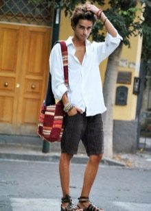 Eine andere Möglichkeit sind Sandalen. Wenn es draußen sehr heiß ist und Sie nur durch die Stadt laufen, können Sie solche Schuhe problemlos tragen. Natürlich das sollten urbane Sandalen aus Kunst- oder Naturleder sein. Strandschuhe aus Gummi funktionieren nicht. Aus dem Zubehör können Sie eine Uhr, ein Lederarmband und eine Sonnenbrille auswählen. Eine kleine Tasche oder ein Rucksack ergänzen den Look.