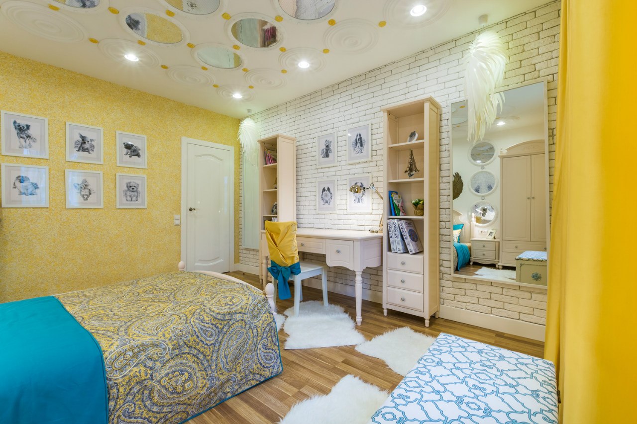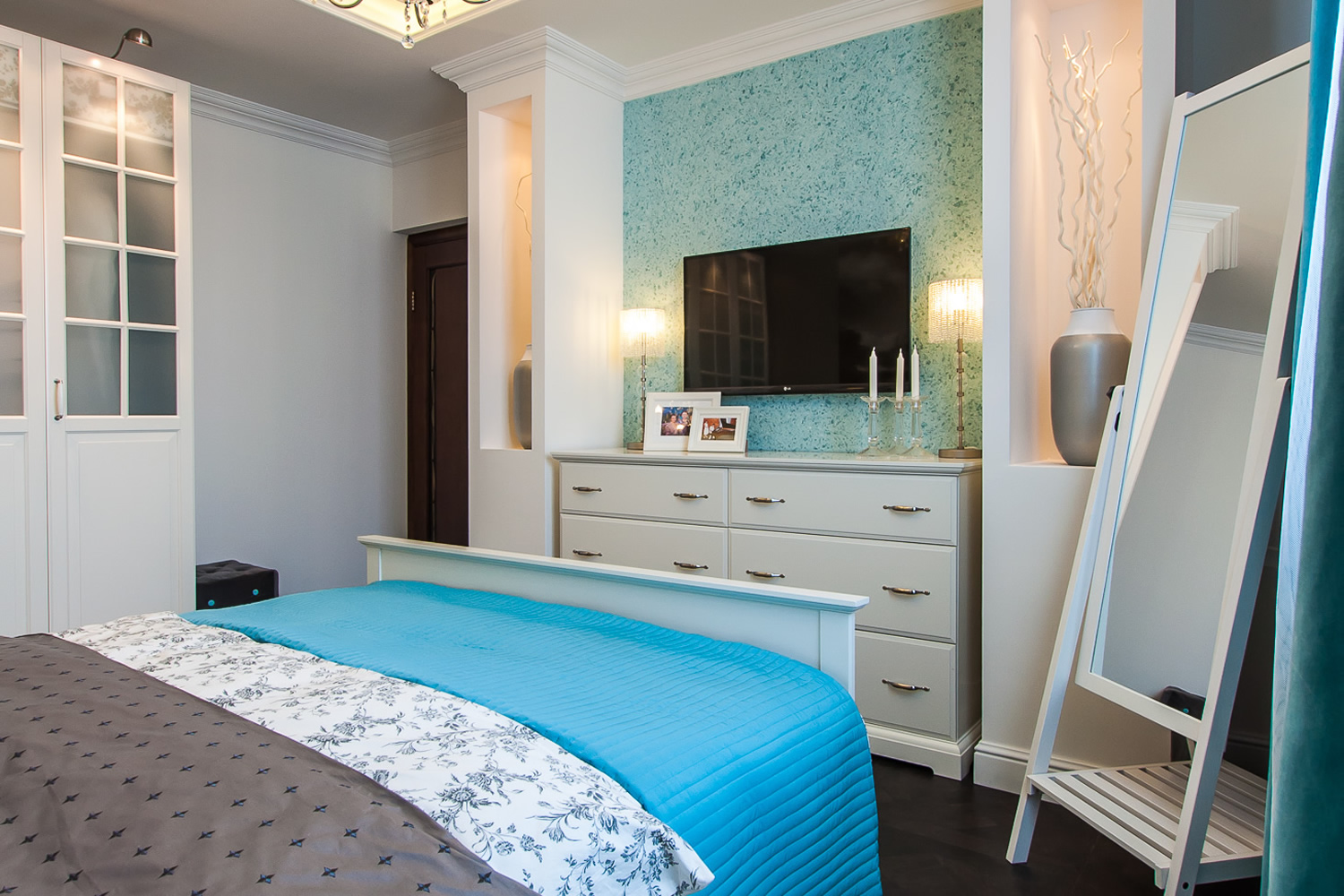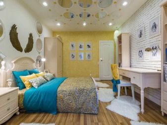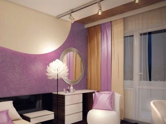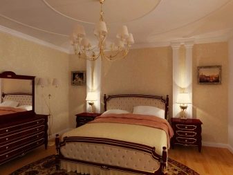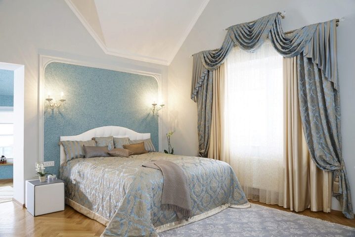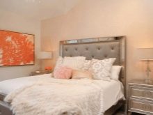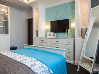 In Schlafzimmern für Erwachsene sind die Wände normalerweise schlicht. Wenn sie nicht mit Möbeln bedeckt sind, können Sie den Raum durch Akzentuierung zonieren. So können Sie beispielsweise die Gestaltungsoption für die Blende über dem Bett wählen, den Schminktisch oder den Spiegelbereich hervorheben.