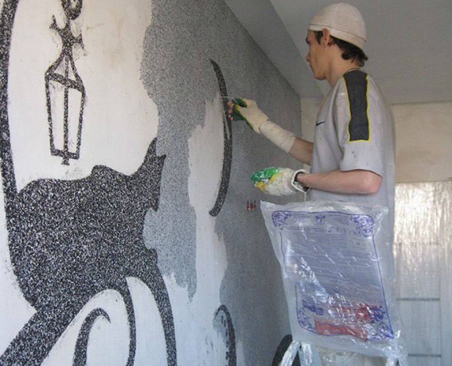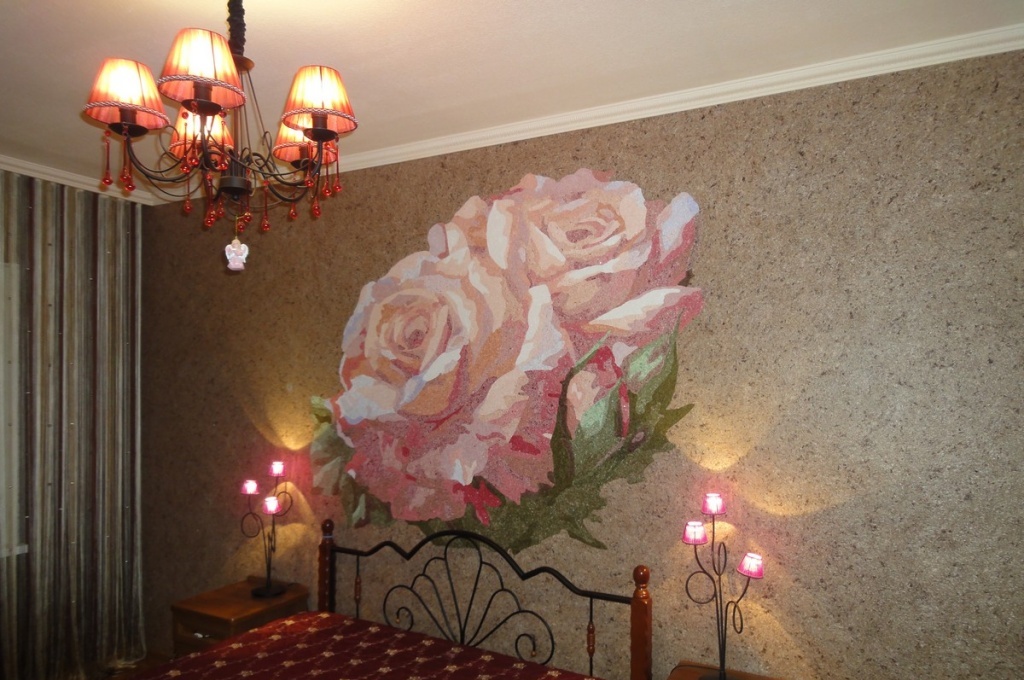 Die Elemente des Bildes werden bis zu den angegebenen Grenzen gefüllt und schließen alle Lücken. Erst danach beginnen sie, den Hintergrund auszufüllen. Nach dem Trocknen werden sie mit einer Kelle über die Oberfläche geführt, wodurch die Beschichtung monolithisch wird.