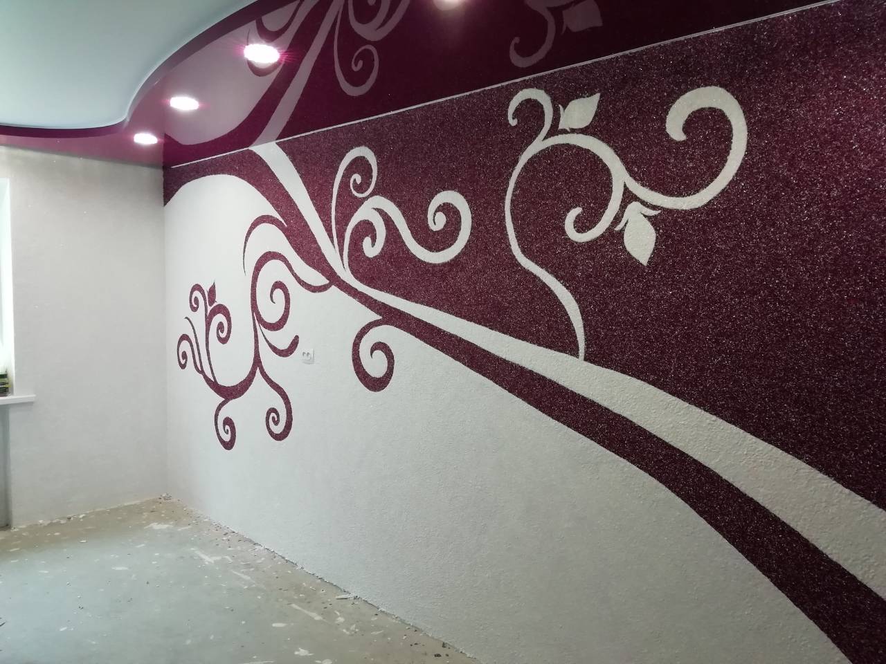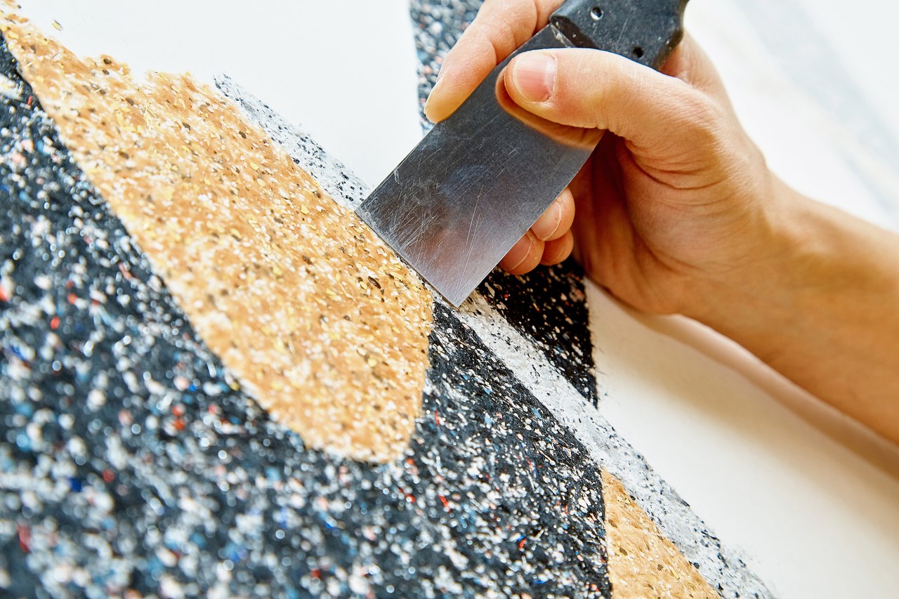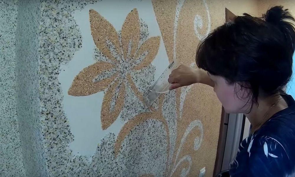 - Auftragen von flüssiger Tapete mit Blumenmuster.