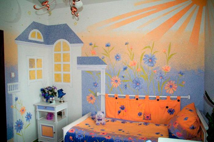 Darüber hinaus können Blumenmotive, Märchenwälder, Schmetterlinge, florale Ornamente an den Wänden von Kinderzimmern zur Geltung kommen.