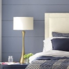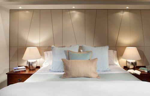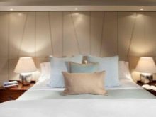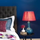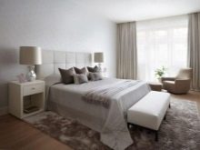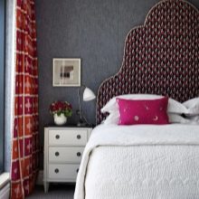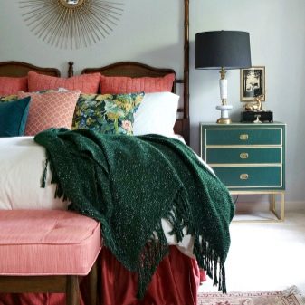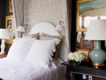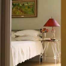 Lampen mit einem hohen Schirm sollten nicht in der Nähe des Bettes platziert werden. Die Nachttischlampe ist in der Regel auf die Textilien abgestimmt.