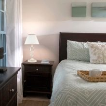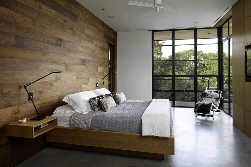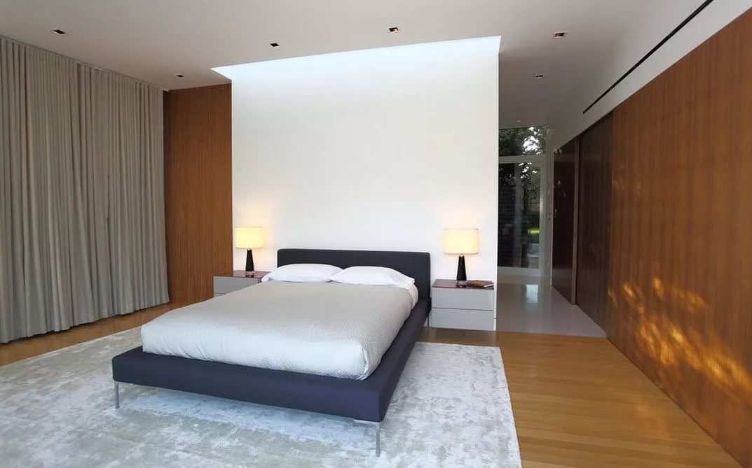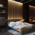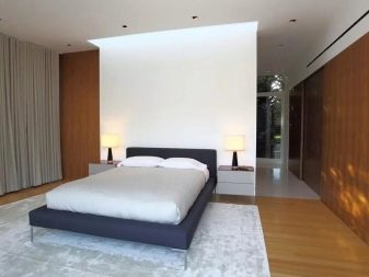 Dieses Zimmer ist in drei Grundfarben eingerichtet. Boden, Wände und Decke sind in hellen Farben gehalten. Die Wand am Kopfende des Bettes ist wie die Möbel aus dunklem Holz. Dekorative Details in dunkler Farbe ergänzen das Interieur. Einer von ihnen ist eine hohe schwarze Lampe. Es fügt sich perfekt in das Interieur des Schlafzimmers ein.