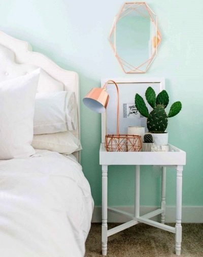 In einem hellen Raum mit blauen Wänden und weißen Möbeln sieht eine kleine roségoldene Lampe sehr schön aus. Es passt gut zu einem kleinen Ständer für kleine Gegenstände und einem ordentlichen Wandspiegel. Die Höhe der Lampe kann bei Bedarf angepasst werden.