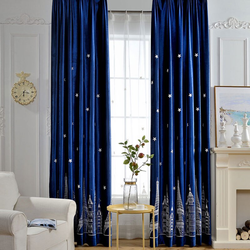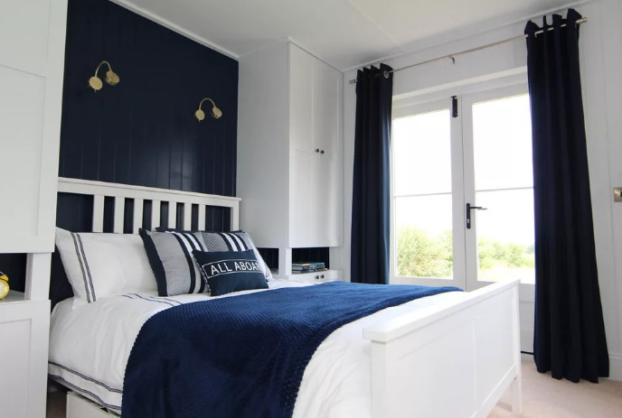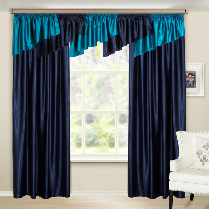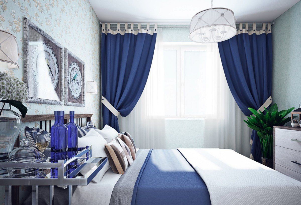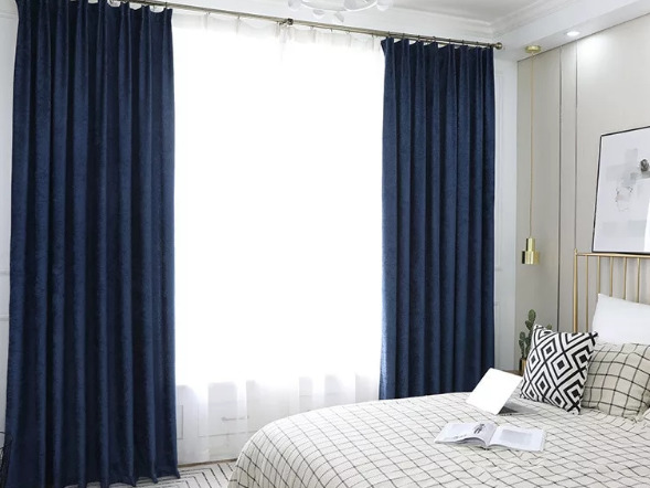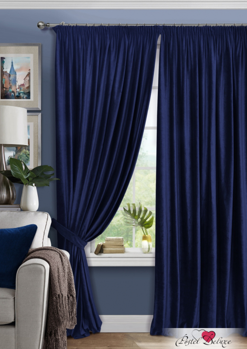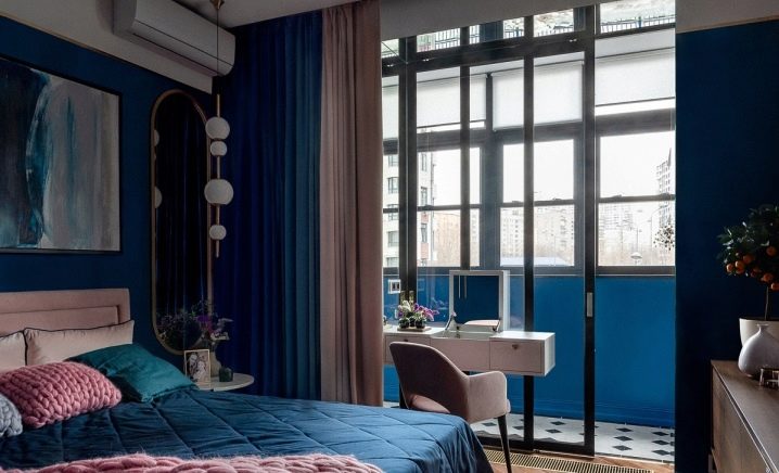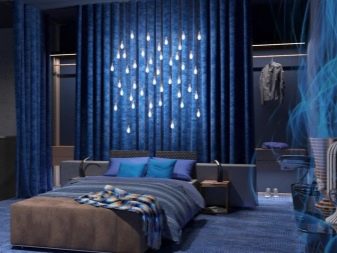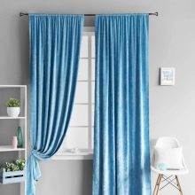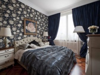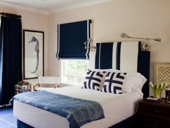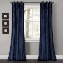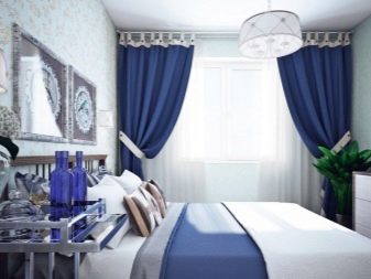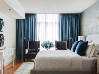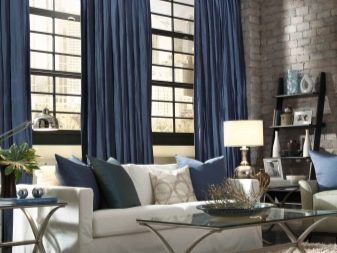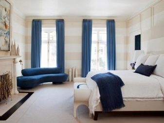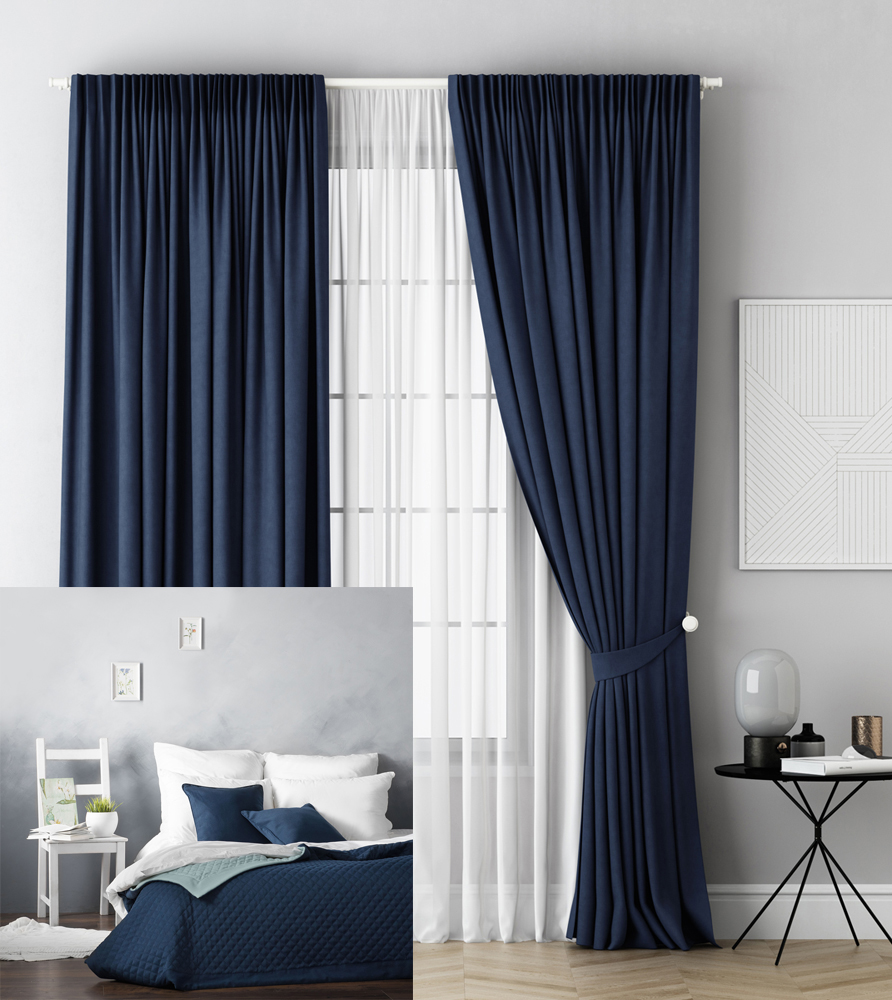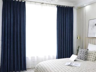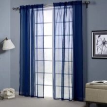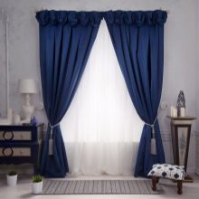 Marineblau. Ein sattes Blau eignet sich hervorragend für geräumige, helle Räume. Mit dieser Farbe können Sie sich entspannen und das Schlechte vergessen. Mit solchen Vorhängen ist es leicht, in einem Schlafzimmer einzuschlafen.
