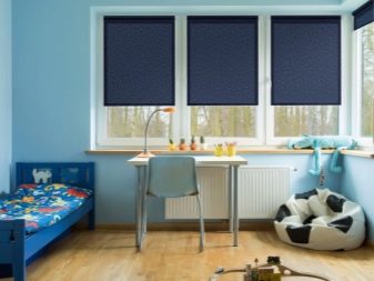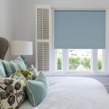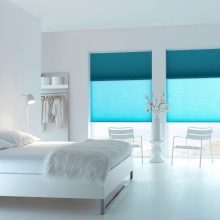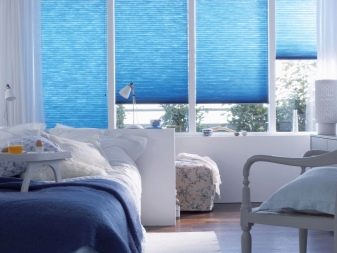 Solche Vorhänge bestehen aus separaten horizontalen oder vertikalen Platten, die miteinander verbunden sind. Sie können aus Stoff oder Kunststoff bestehen. Hellblaue Jalousien sehen in modernen Innenräumen gut aus.