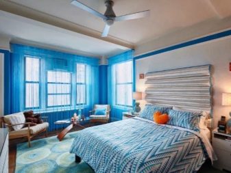 Profis empfehlen dunkelblau für den Einsatz in einem hellen Raum. In diesem Fall wirkt der Raum nicht zu düster. Bei der Dekoration eines Raumes in blauen und weißen Farben ist es auch wichtig, auf zusätzliche Beleuchtung zu achten.