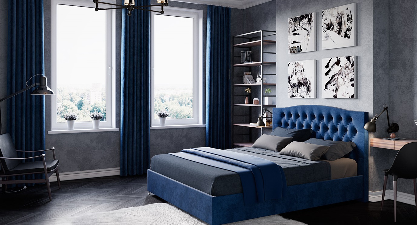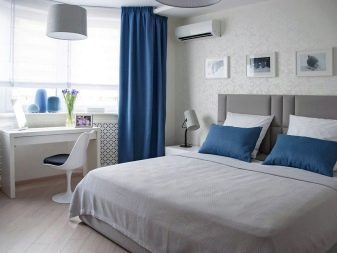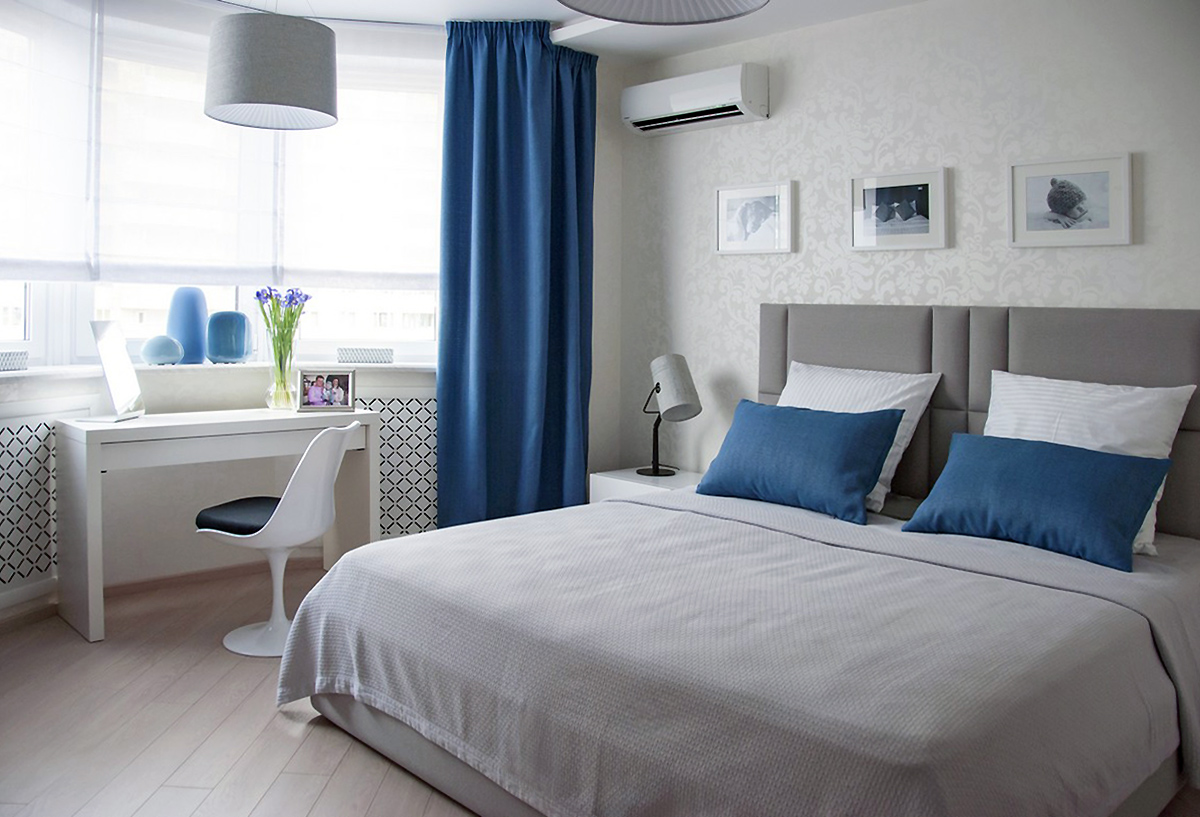 Blau ist eine elegante und edle Farbe, die oft in der Schlafzimmerdekoration verwendet wird. Vorhänge in hellen und dunklen Farbtönen eignen sich sowohl für große als auch für kleine Räume.