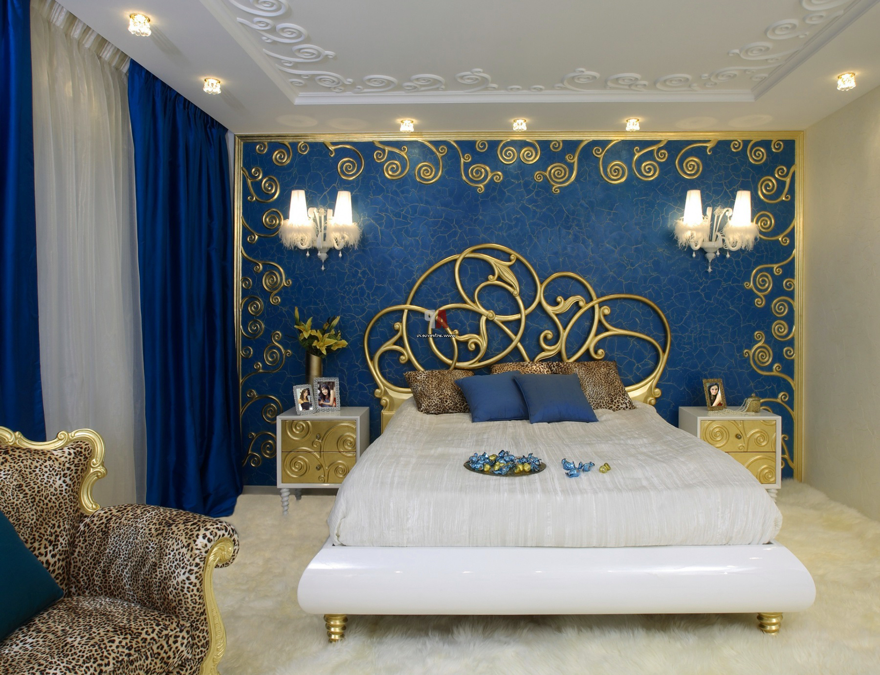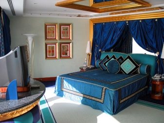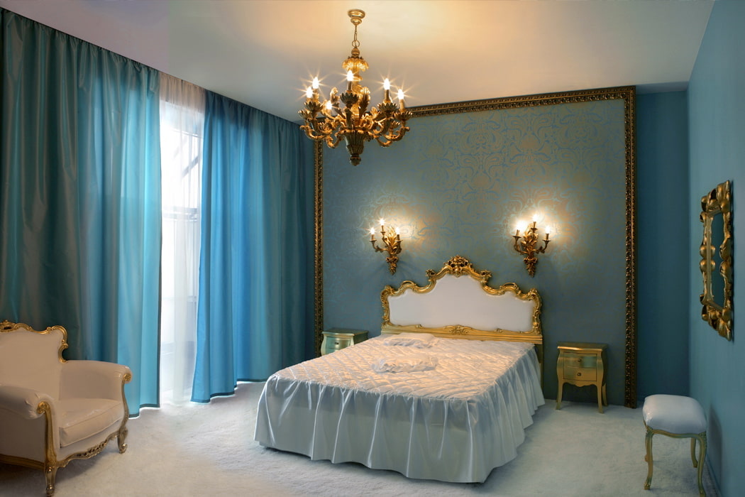Die Kombination von Dunkelblau mit Gold sieht interessanter aus. Diese Option ist ideal für Räume im klassischen Stil. Die Hauptsache bei der Dekoration eines Raumes ist, es nicht mit goldenen Details zu übertreiben.