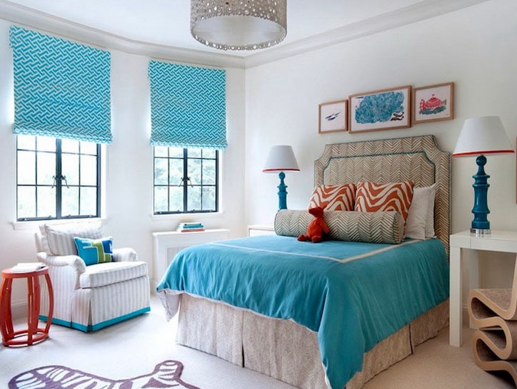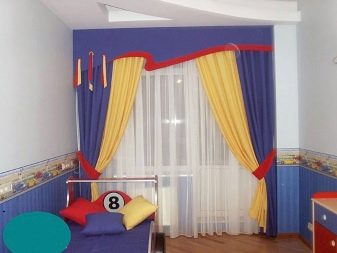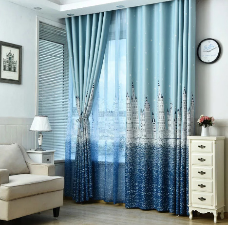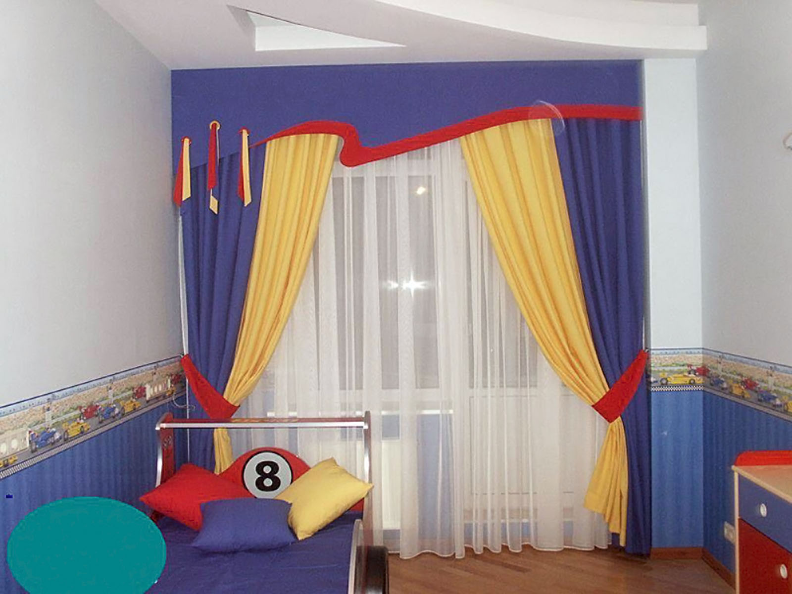 Die Kombination aus Blau und Gelb erscheint vielen zu hell. Aber diese Gestaltungsmöglichkeit eignet sich gut für ein Kinderzimmer. Kornblumenblaue Vorhänge lassen sich wunderbar mit hellen Regalen, Teppichen, Tagesdecken oder Spielzeug kombinieren.