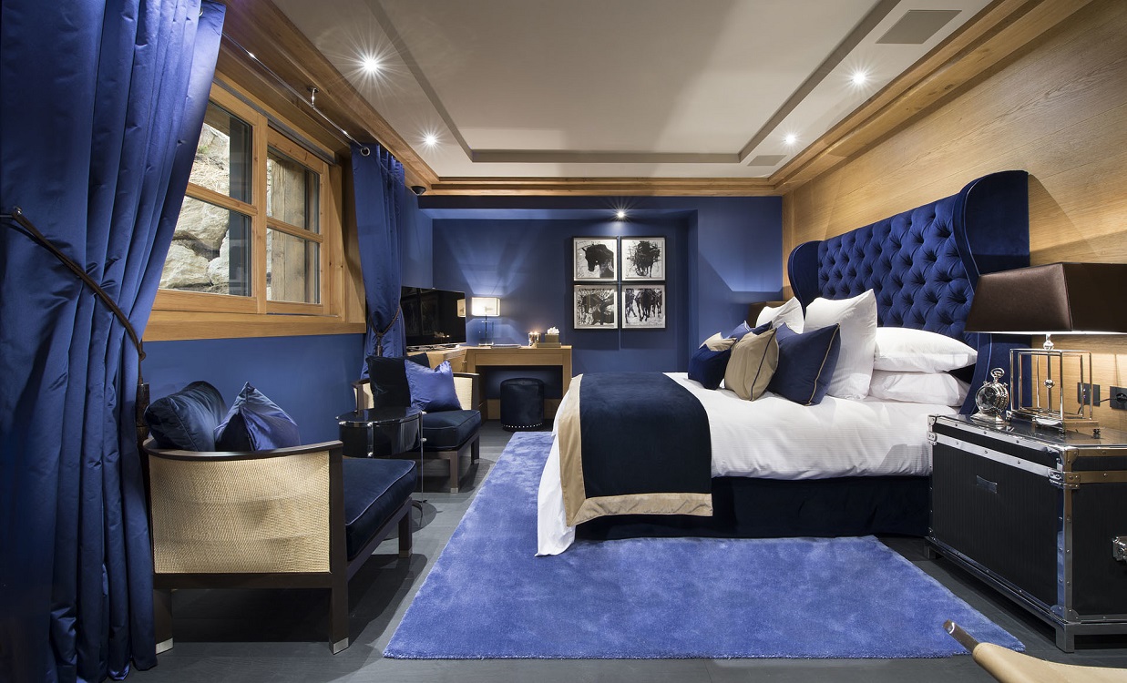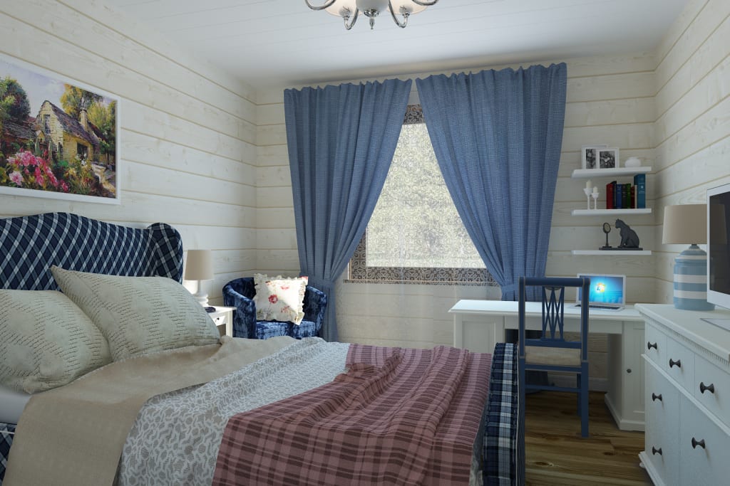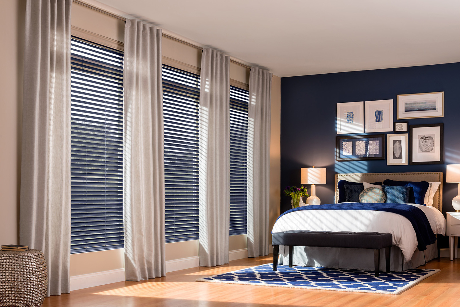 Blaue Vorhänge im Inneren des Schlafzimmers