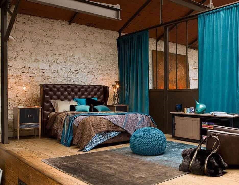 Einfache schlichte Vorhänge aus dichtem Stoff sehen in einem Loft-Stil gut aus. Sie passen gut zu Naturholz und Ziegeln. Zu den Vorhängen passende Kissen ergänzen das Interieur. Diese einfachen Details machen den Raum stilvoller.