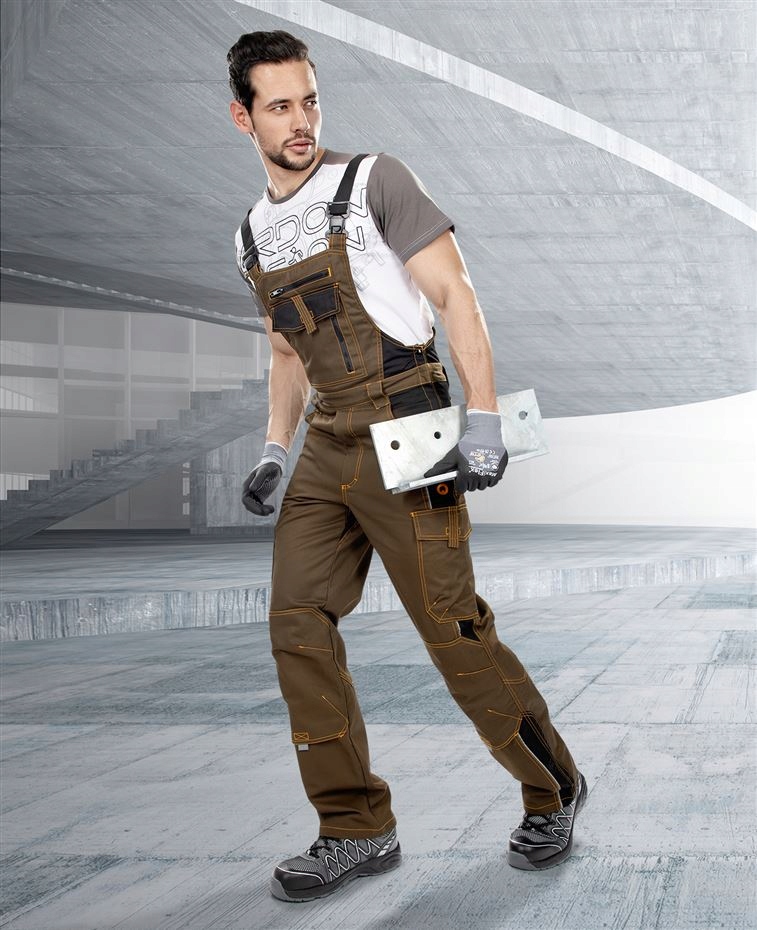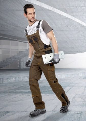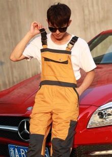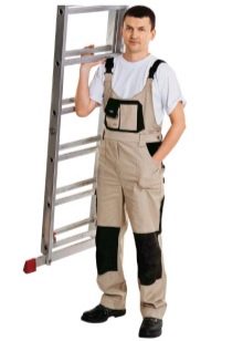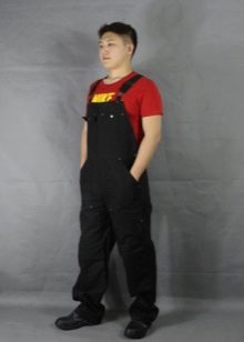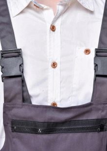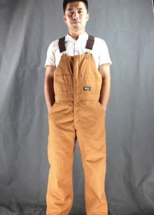 Die erste ist eine Hose mit einem zusätzlichen Stoffabschnitt an Brust- und Schultergurten. Darunter wird meist ein T-Shirt, Hemd oder eine Jacke getragen. Auch eine Jacke aus einem ähnlichen Material kommt oft mit einem Halboverall. Diese Option ist praktisch, da die Oberbekleidung bei Bedarf ausgezogen werden kann, wenn es plötzlich zu heiß wird.