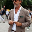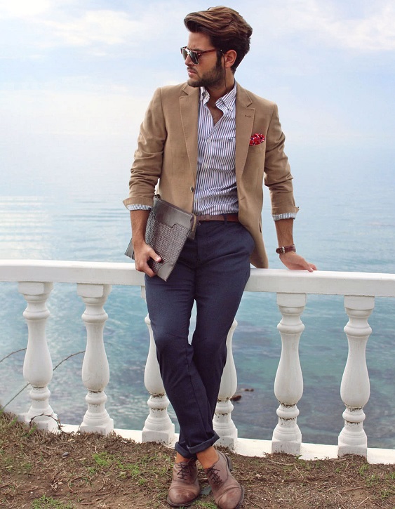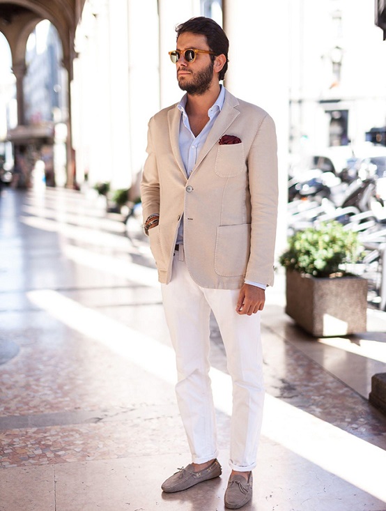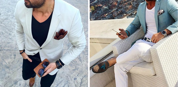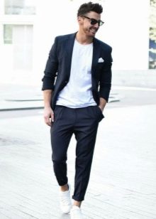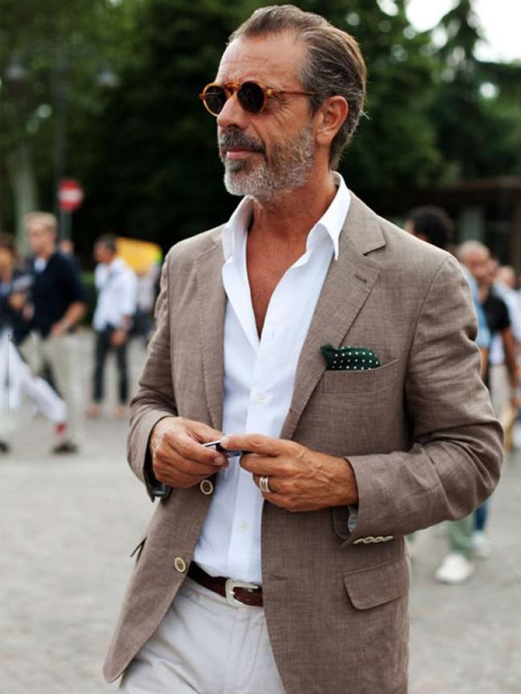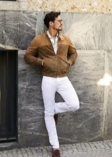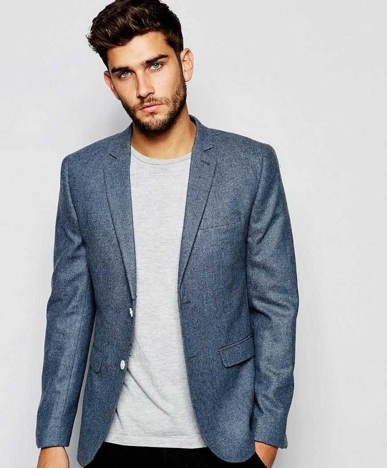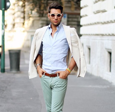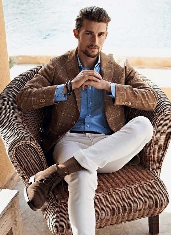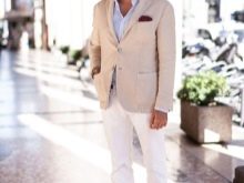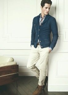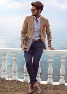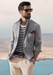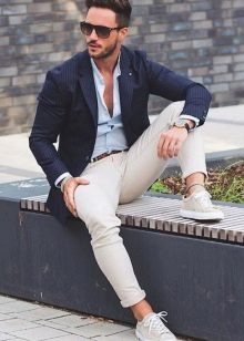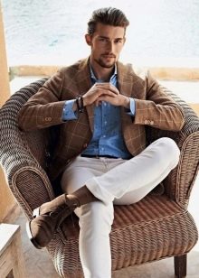 Ein moderner Blazer sieht aus wie ein Club, also eine "leichte" Jacke. Es sieht weniger formell aus als das übliche. Materialien wie Baumwolle und Leinen sind relevant. Natürliche Töne wie Braun, Beige und Grün passen hervorragend zu hellen Hosen.Im Allgemeinen wird in diesem Stil sehr oft die Kombination "dunkles Oberteil, helles Unterteil" verwendet, als Gegenteil der Klassiker.
