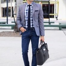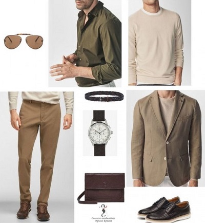 - klassisch - schlichtes oder einfarbig bedrucktes Hemd, Blazer, neutrale Chino, dunkler Gürtel und Schuhe;