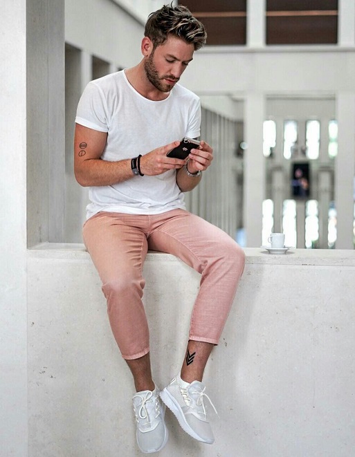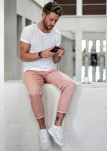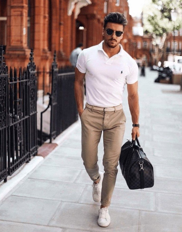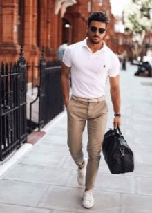 Nicht das beste Beispiel für einen maskulinen Smart Casual, aber manchmal ist das okay. Nur der Style des T-Shirts sollte möglichst schlicht sein, die Passform sollte eng anliegen, und natürlich sollte es hochwertig und nicht verwaschen sein. Ein T-Shirt wird eine gute Ergänzung zu einer olivgrünen Anzughose sein. Sie wird ein weiteres interessantes Tandem mit weißen Chinos machen.