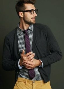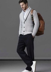 - Interessantes vielschichtiges Bild nach dem Prinzip „je mehr Dinge, desto besser“. Der Trend zu solch komplexen Bögen ist nach wie vor aktuell. Außerdem frieren Sie bei so vielen Dingen definitiv nicht.Die Hauptsache ist, dass alle Garderobenartikel lakonisch sind. Einfarbiges Hemd, Pullover mit V-Ausschnitt, Jeans, Strickjacke und Socken mit gleichem oder ähnlichem Strick.