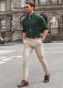 Damit Hosen aus so kapriziösem Stoff gut passen, sie können auf Bestellung genäht werden. Es ist ein wenig mühsam, aber ein solches Element der Garderobe wird zu einem der wichtigsten. Hosen in Khaki oder einem ähnlichen Olivton passen gut in das Stilkonzept.