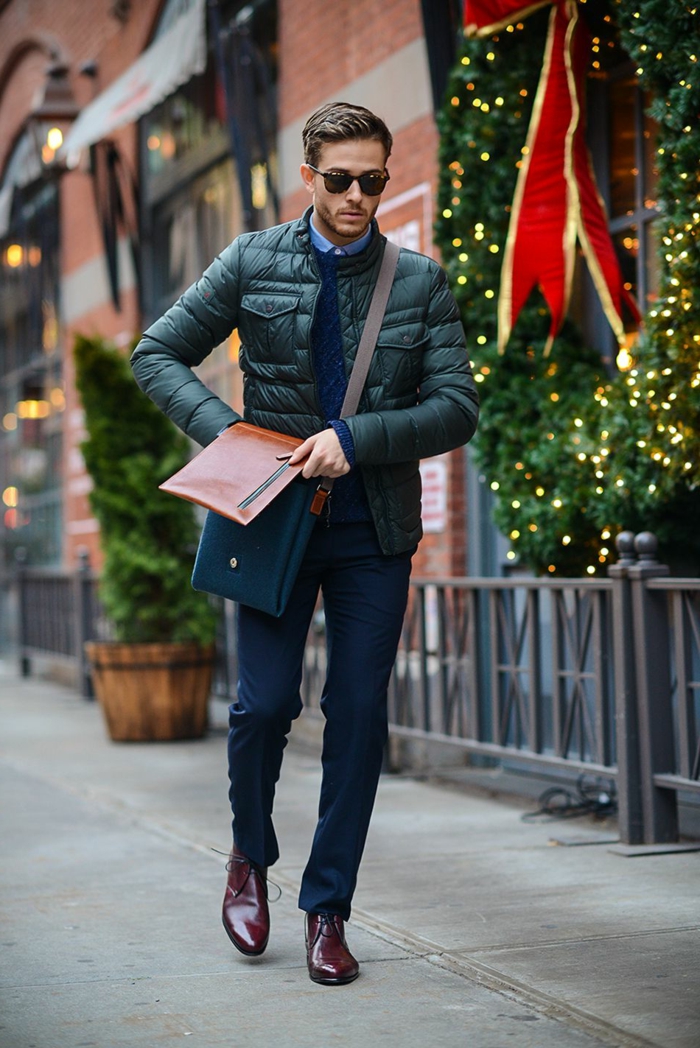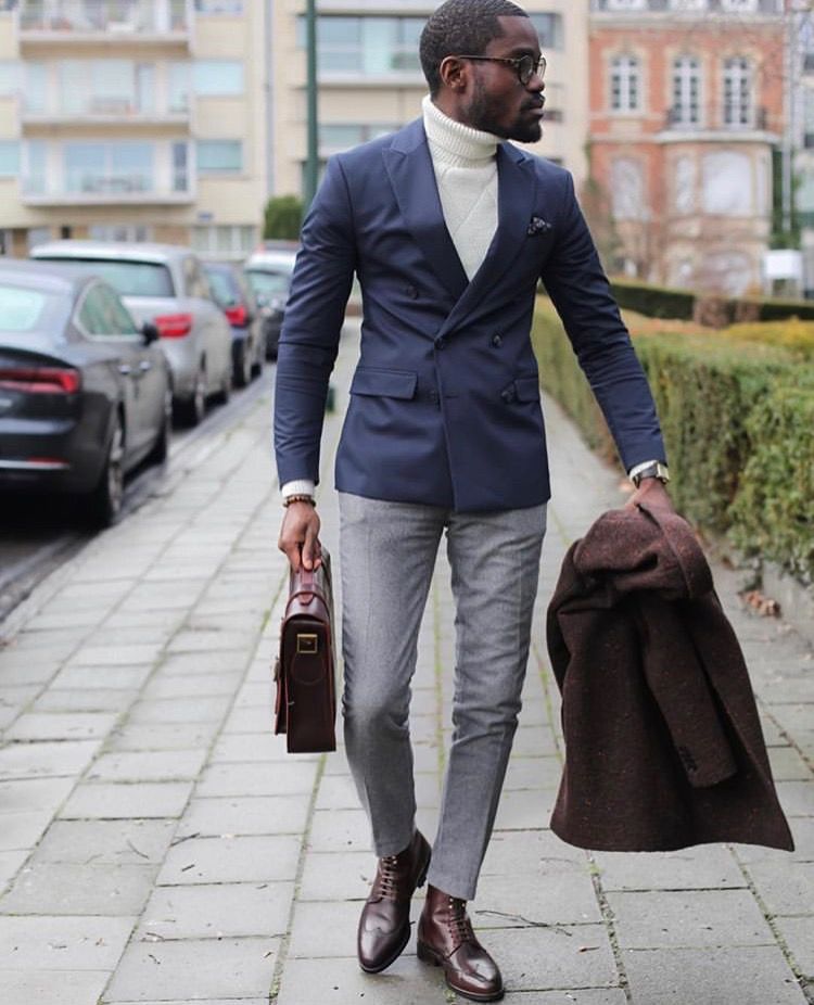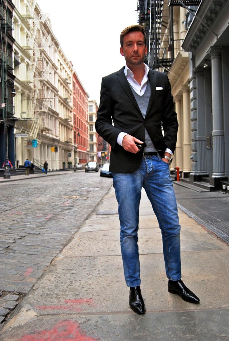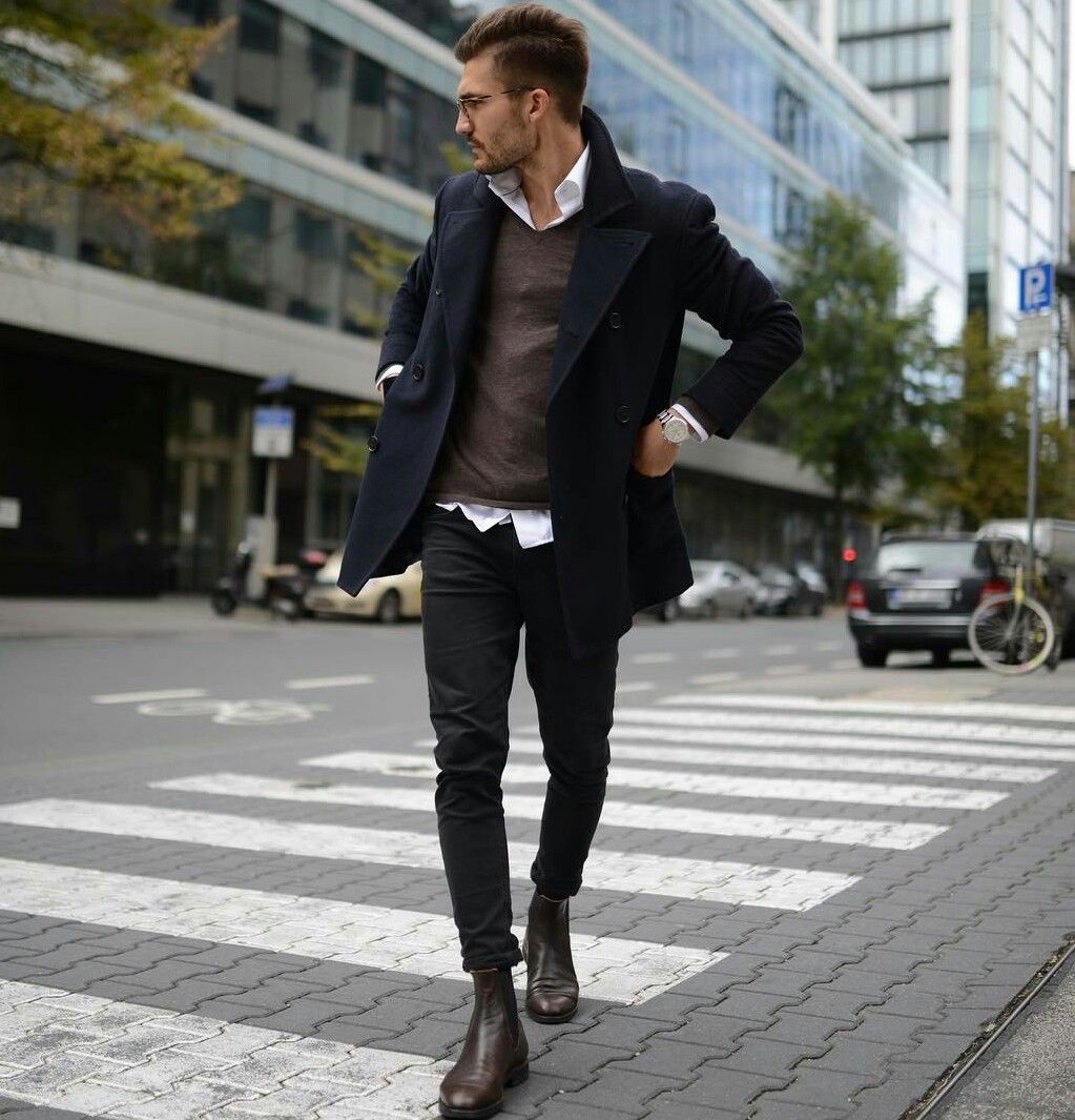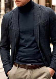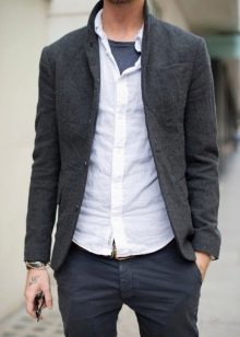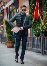 Eine Jacke ist für diesen Stil kein Muss, aber bei kühlem Wetter ist sie nützlich. Sie können es mit Hemd und Jeans, mit Hose, mit Rollkragen kombinieren.