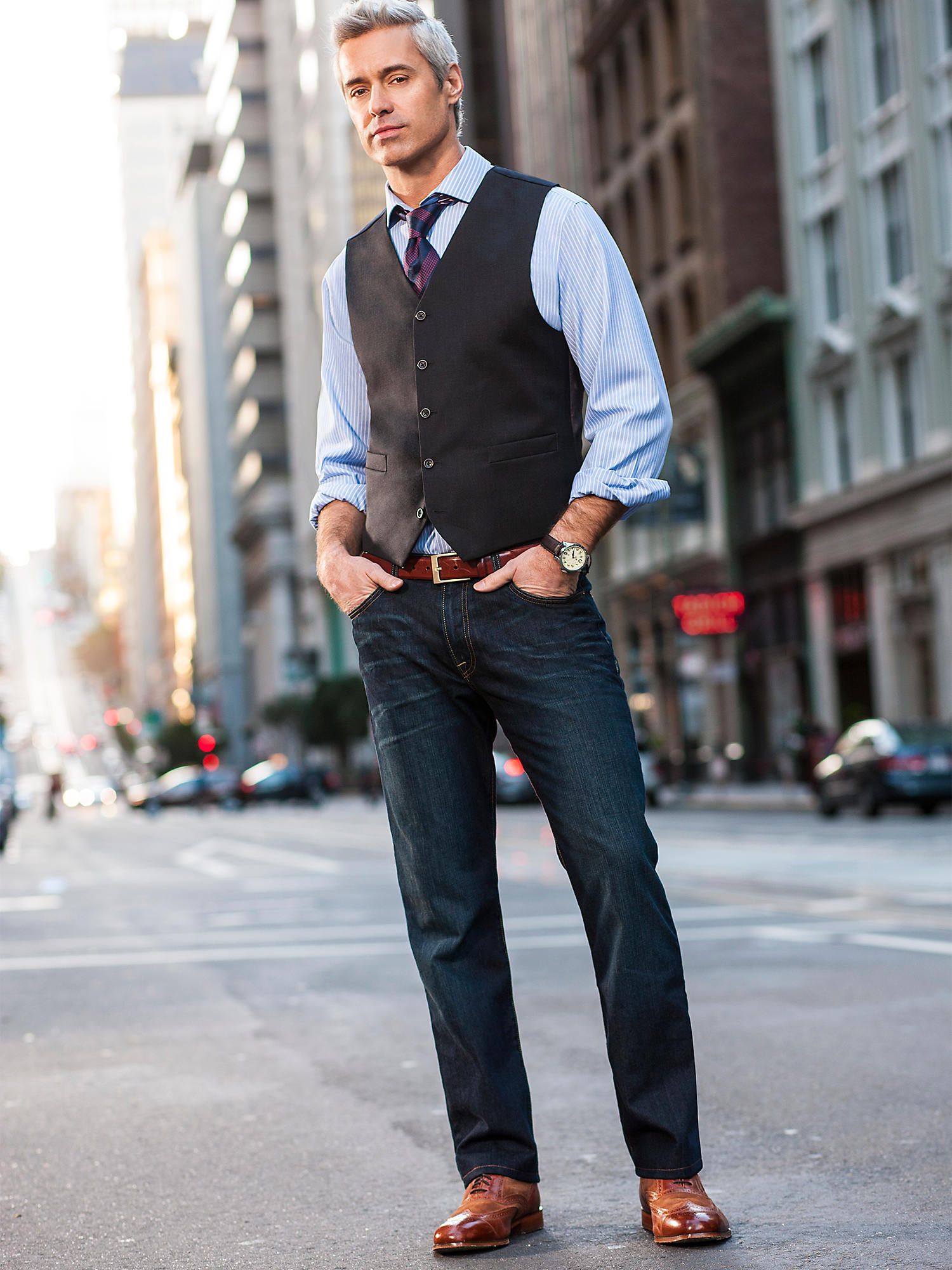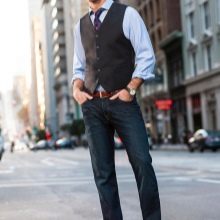 Wer Jeans liebt und sich auch im Büro nicht davon trennen möchte, kann sie mit einer Weste kombinieren. Ein solches Kleidungsstück im klassischen Stil verleiht vor allem in Kombination mit unifarbenem Hemd und Krawatte Business-Spirit.
