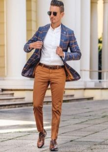 Hose und Hemd sind eine klassische Kombination. Ein dezenter Käfig verleiht dem Bild Tiefe. Gürtel und Schuhe in der gleichen Farbe - Accessoires spiegeln sich wider und dienen als Schlussakkord.