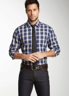 Ganz dezenter Look mit Jacke und Hose. Die blau-graue Serie ist eine klassische Lösung. Gleichzeitig befindet sich das Hemd in einem Käfig und es gibt keine Krawatte, was die Schleife lockerer und lässiger macht.