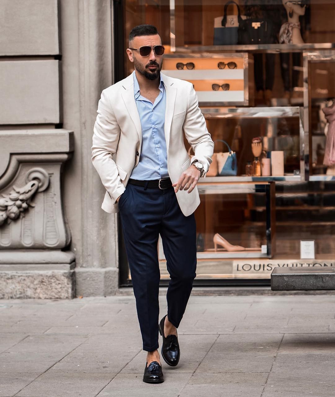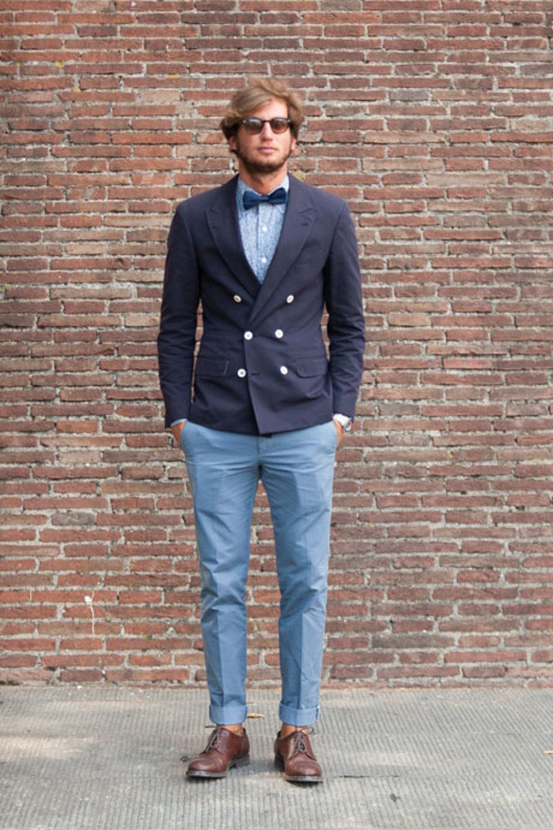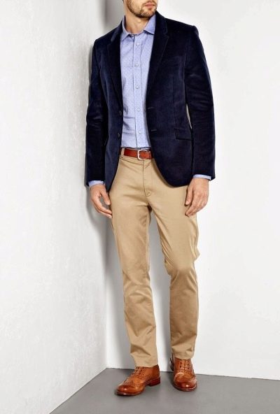 Scheuen Sie sich nicht, verschiedene Materialien zu kombinieren. Eine Veloursjacke kann ein interessanter Fund sein.Es fällt durch seine Textur sofort auf, daher wäre es angebracht, einen tiefblauen Farbton zu wählen, der solide und zurückhaltend wirkt. Der Look wird durch ein leichteres Hemd und eine leichtere Hose ausgeglichen.