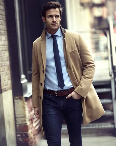 Option für eine kältere Zeit, mit Mantel. Der beige Farbton wird mit vielen Kleidungsstücken kombiniert. Dies ist eine Schleife zu Jeans, die jedoch durch ein klassisches Hemd und eine Krawatte ergänzt wird, wodurch das Bild im Rahmen eines Business-Stils bleiben kann.
