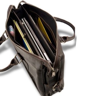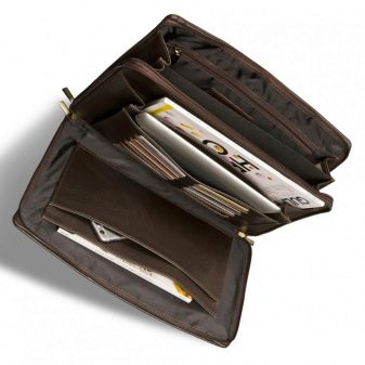 Am häufigsten werden Portfolios in lakonischen Farben produziert: Schwarz, Braun oder dunkle Kirsche. Die Must-Have-Teile für dieses Modell sind Taschen, mehrere Fächer, ein kleiner Griff und ein Schultergurt. Produkte wirken harmonisch in Kombination mit Business-Anzügen.