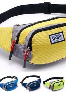 Sie gelten als sehr angenehm zu tragen. rechteckige und abgerundete Modelle mit abnehmbaren Trägern. Normalerweise sind solche Produkte mit speziellen zusätzlichen Verschlüssen ausgestattet, mit deren Hilfe die Tasche an einem Hosengürtel, einem Riemen eines Touristenrucksacks, an Sportgeräten befestigt werden kann.
