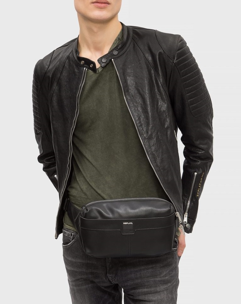 - Ein weiteres markantes Beispiel für einen lässigen Look sieht den Einsatz eines Ensembles aus dunkelgrauer Hose oder Jeans, einem grünen Jersey-T-Shirt und einer kurzen Motorrad-Lederjacke vor. Eine hervorragende Ergänzung zu diesem Ensemble ist eine rechteckige Gürteltasche aus Leder.