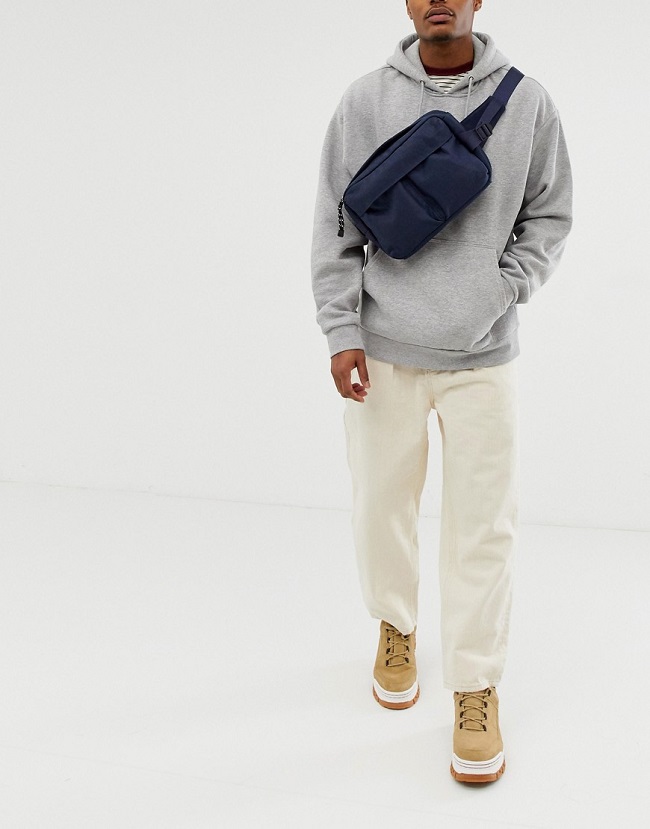 Lässige Taschen ideal, um einen lässigen Look zu kreieren. Es wird empfohlen, sie mit T-Shirts und Jeans, Strickjacken, Pullovern, Sweatshirts und Hoodies, Hosen und Chinos zu tragen. Junge Männer tragen oft Gürteltaschen zu lässigen, weiten Jeans und Sweatshirts. In einem solchen Ensemble wird das Accessoire vorzugsweise auf der Schulter (Cross-Body) getragen.