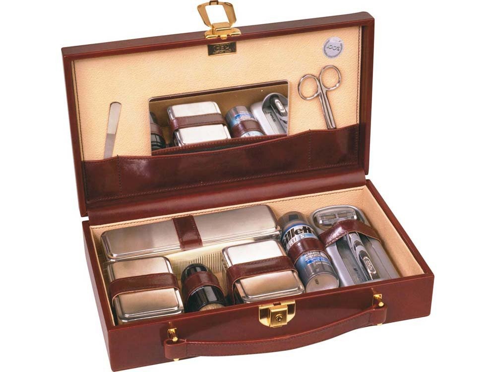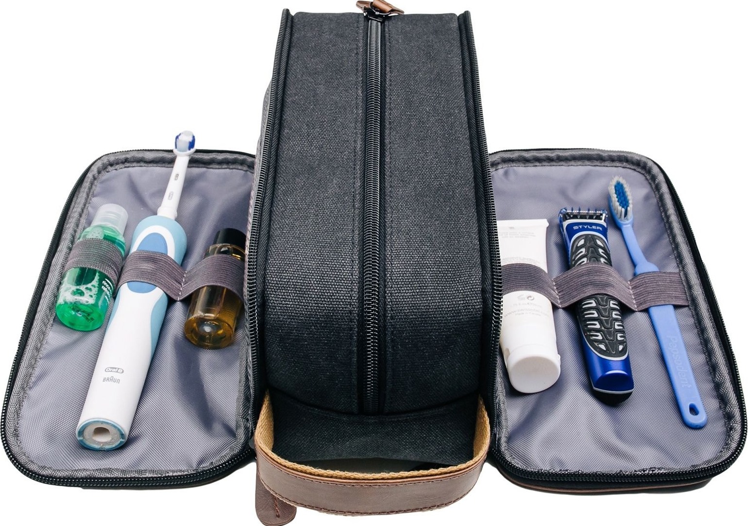 Die Herren-Kosmetiktasche hat eine hohe Funktionalität und besteht aus mehreren Innenfächern, sowie speziellen Halterungen, die darin verwendet werden. Dank dieser Füllung können solche Gegenstände darin aufbewahrt werden., als Set für Maniküre, Rasur und Toilettenartikel, Zahnbürste und -paste, Kamm, Deodorant und Eau de Toilette, Kosmetik vor und nach der Rasur, Shampoo und Conditioner, Körperpflegeprodukte und unentbehrliche Medikamente. Einige Modelle haben auch Fächer für Dokumente und Autoschlüssel.
