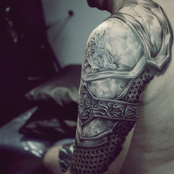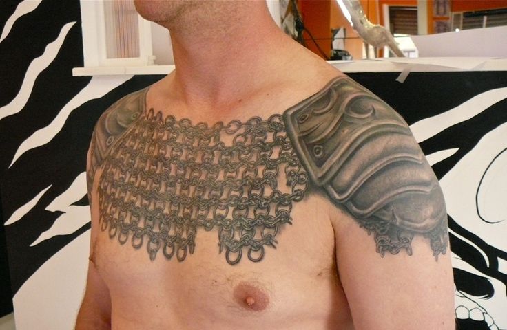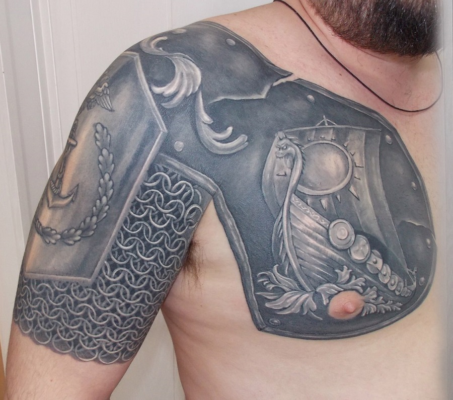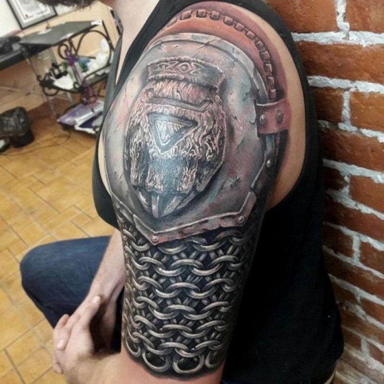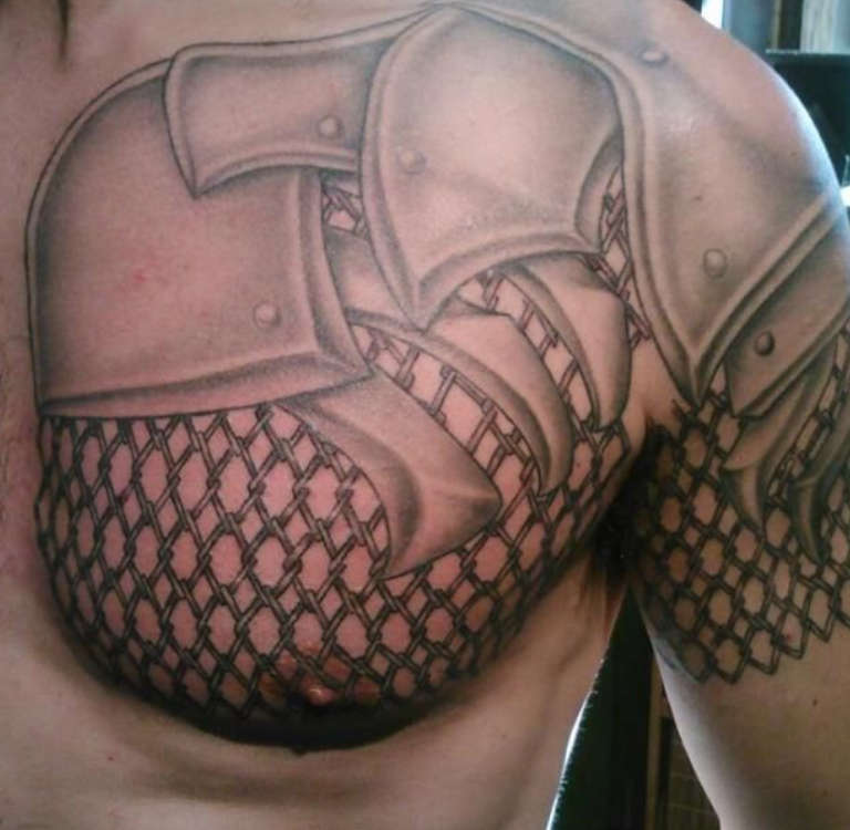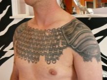 - Kettenhemd. Für den Besitzer eines solchen Tattoos dient das Bild als eine Art Schutzschild, das ihn vor negativen Manifestationen schützt. Sein Besitzer ist daran gewöhnt, die beabsichtigten Ziele zu erreichen, er wird sein Ziel immer erreichen und Schwierigkeiten überwinden. Solche Bilder werden oft mit verschiedenen Turnieren in Verbindung gebracht. Der Besitzer des Tattoos hat seine eigenen Überzeugungen und hält sich daran. Die Zeichnung kann mit verschiedenen Details in Form von Tierbildern oder mysteriösen Kreaturen ergänzt werden. Die Elemente, die in der Komposition enthalten sind, spielen eine bedeutende Rolle, da sich die Bedeutung des Tattoos dadurch ändern kann.