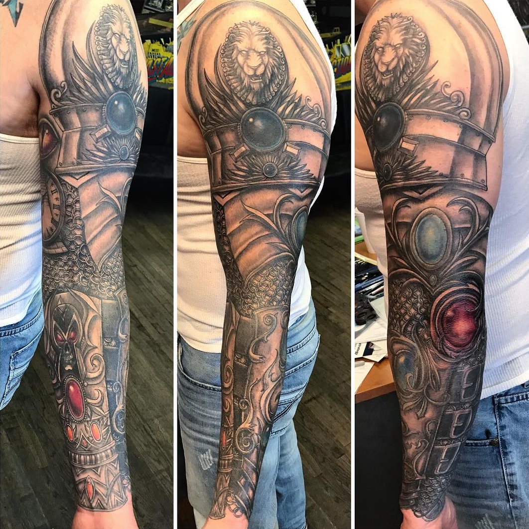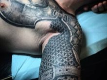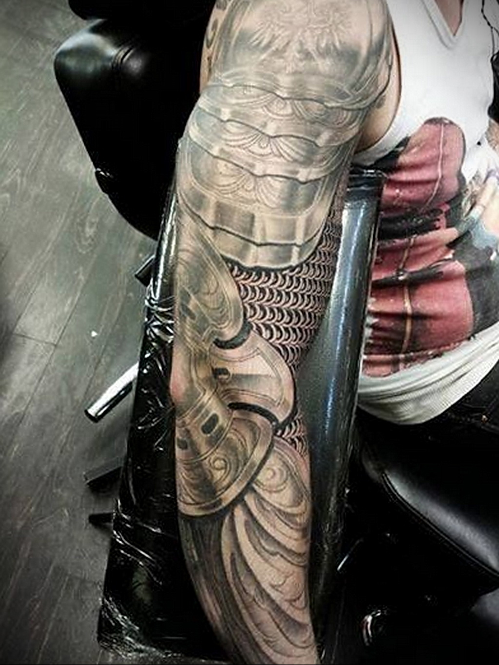 - Unter den verschiedenen Typen sind Rüstungsbilder in Form eines Ärmels sehr beliebt. Solche Bilder bedecken vollständig die gesamte Oberfläche der Hand in einem Kreis. Dank dieser Anordnung gelingt es vielen, die Spuren alter Tätowierungen, erfolgloser Tätowierungen, zu verbergen. Solche Bilder sind ein Symbol für Stärke, Mut und Mut. Demnach sind solche Bilder am Körper von Frauen kaum zu sehen. Das Zeichnen einer solchen Skizze zeigt den Charakter der Person, die ihn ausgewählt hat.