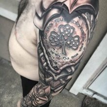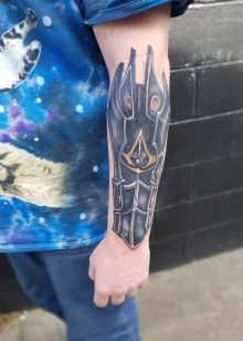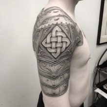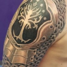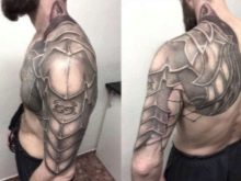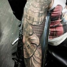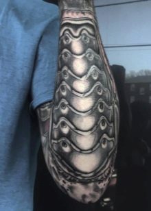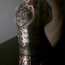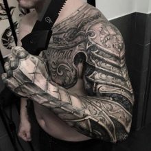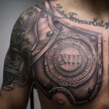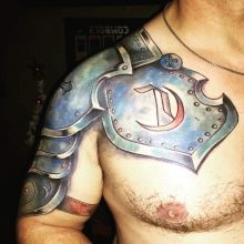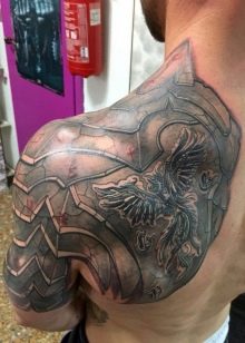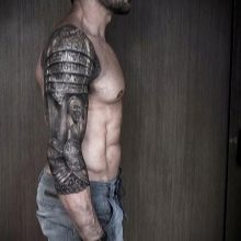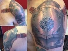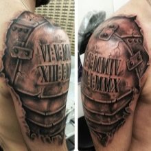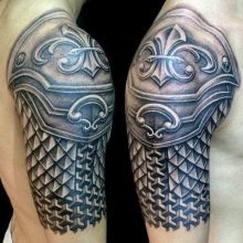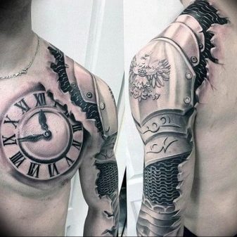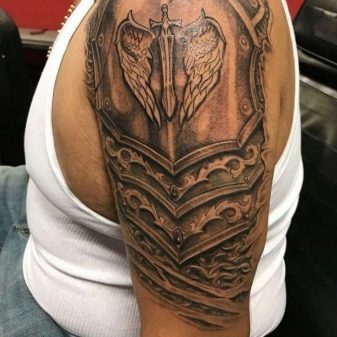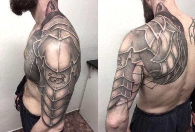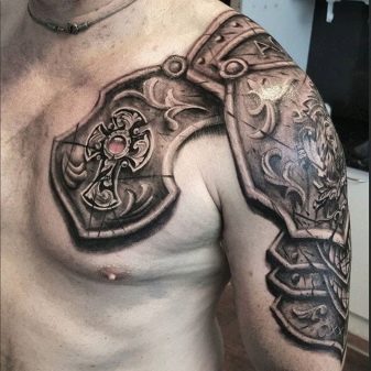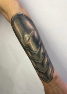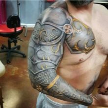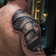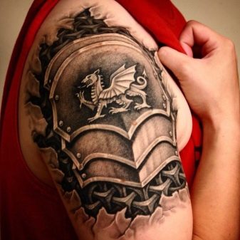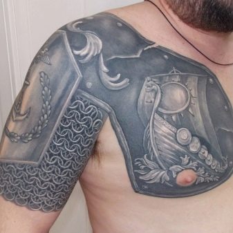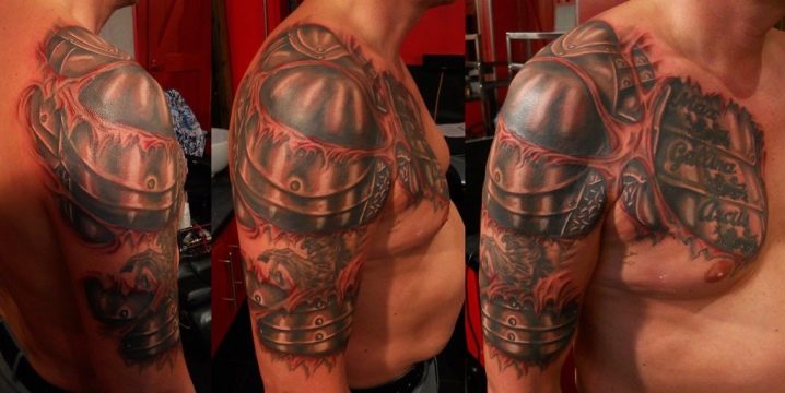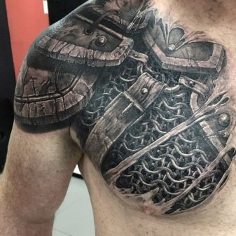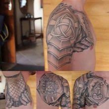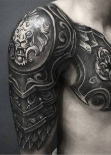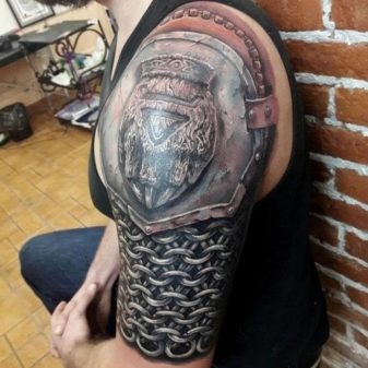 Unter der männlichen Bevölkerung haben Tattoos in Form von Rüstungen seit vielen Jahren nicht an Popularität verloren. Ein Mann ist der Beschützer seiner Familie, seines Heimatlandes. Es ist die Rüstung, die seit langem hilft, im Kampf gegen Feinde vor Verletzungen zu schützen. Ein Tattoo mit einem ähnlichen Bild symbolisiert Stärke und Ausdauer.