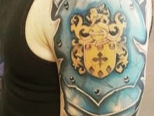- Teller. Gebrauchte Rüstung zusammen mit Rüstung. Das Aufkommen von Schusswaffen hat dazu geführt, dass dieser Schutz abgeschafft wurde. Tattoos in Form von Rüstungen werden häufiger von romantischen Männern gewählt. Zu den Hauptbedeutungen solcher Bilder gehören Zielstrebigkeit, Loyalität, Stärke und Macht. Der Besitzer des Tattoos nutzt die Körperzusammensetzung als Talisman.Es fördert die Energiespeicherung und verhindert die Verschwendung von Energie.