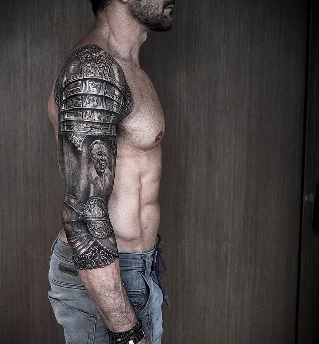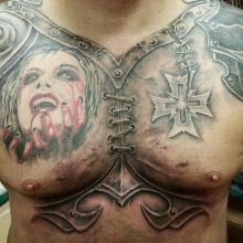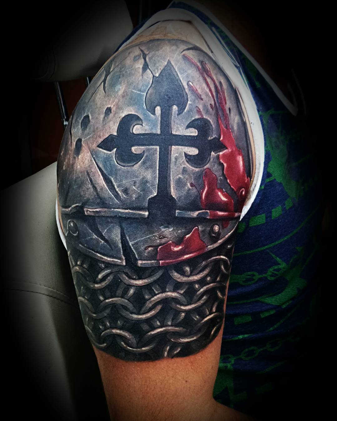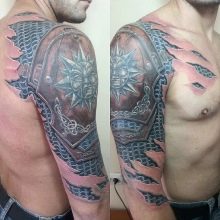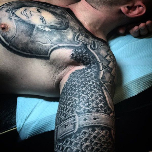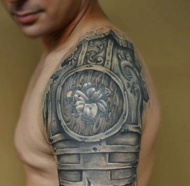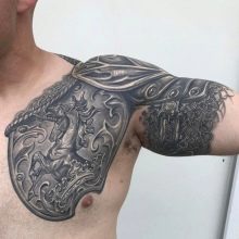Der Schulter- und Unterarmbereich gelten als die erfolgreichsten und gefragtesten Orte für brutale Tattoos. In diesen Bereichen werden sie unglaublich beeindruckend aussehen. Dies gilt insbesondere für die Besitzer einer schönen muskulösen Figur. Rüstungstattoos an den Schultern werden oft durch realistische Kratzer oder Blutflecken ergänzt.