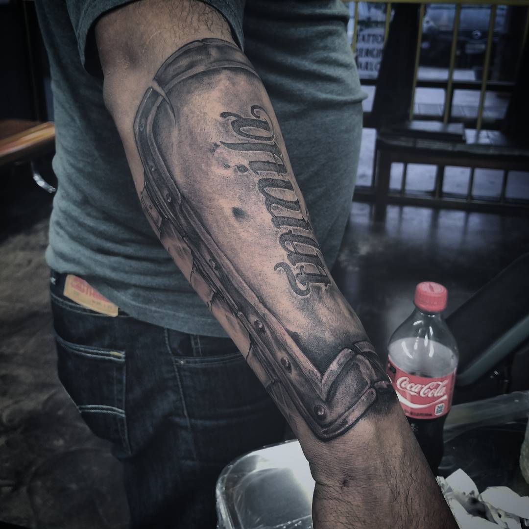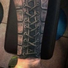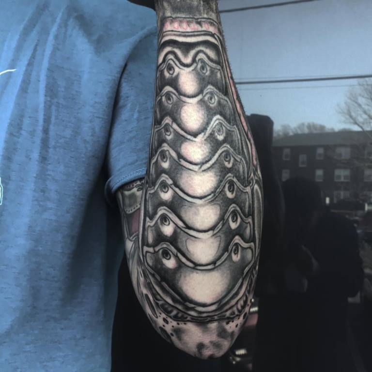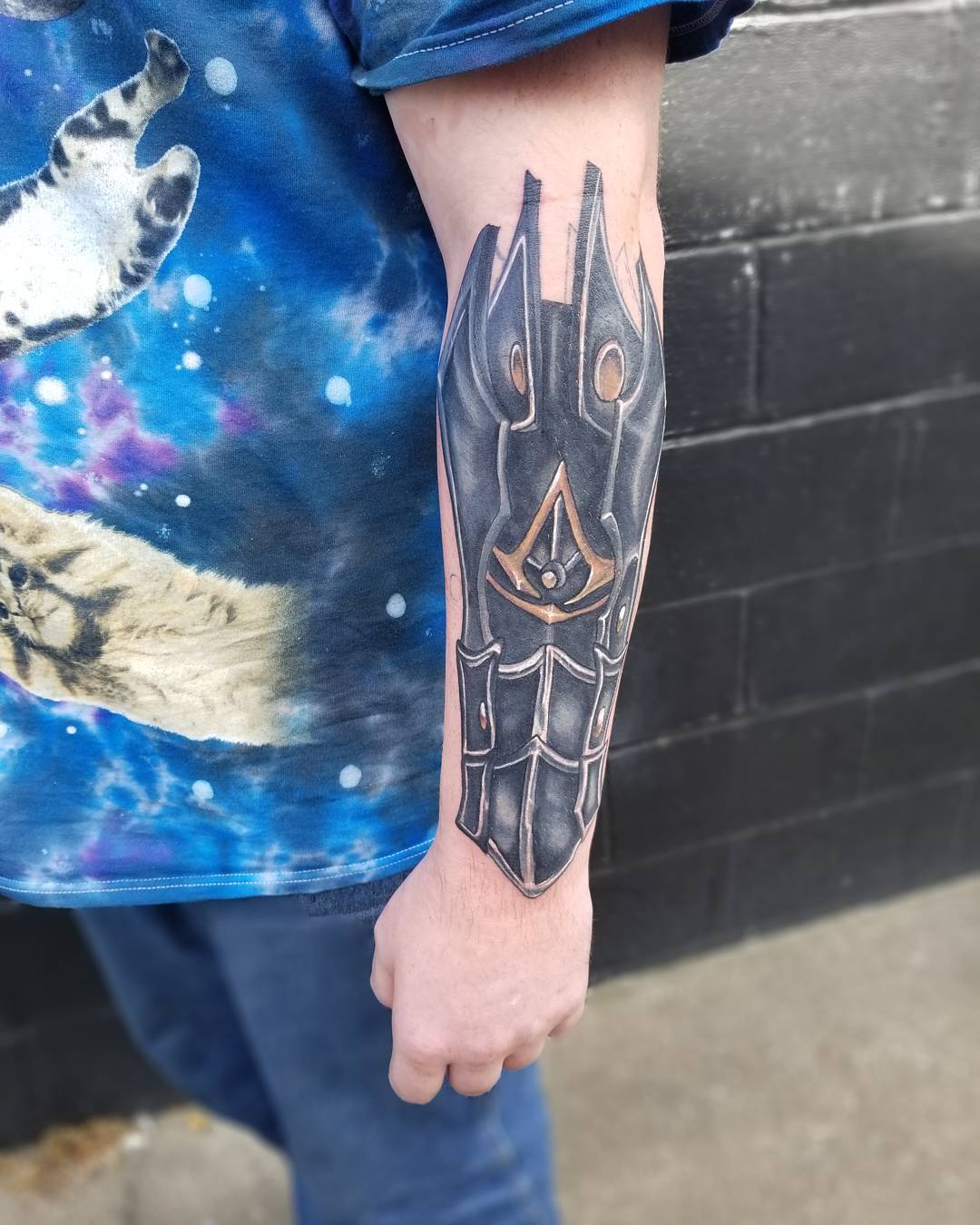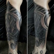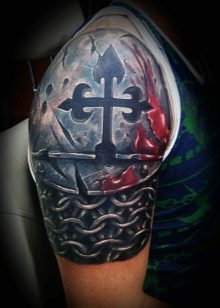 Der Schulter- und Unterarmbereich gelten als die erfolgreichsten und gefragtesten Orte für brutale Tattoos. In diesen Bereichen werden sie unglaublich beeindruckend aussehen. Dies gilt insbesondere für die Besitzer einer schönen muskulösen Figur. Rüstungstattoos an den Schultern werden oft durch realistische Kratzer oder Blutflecken ergänzt.