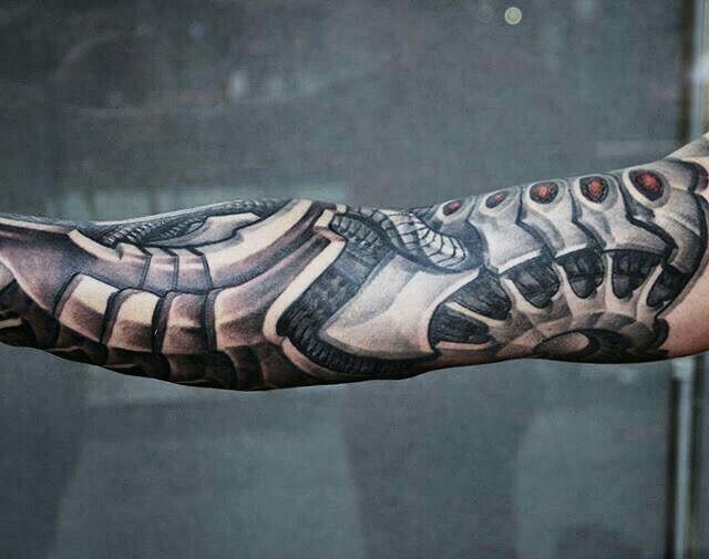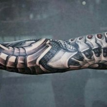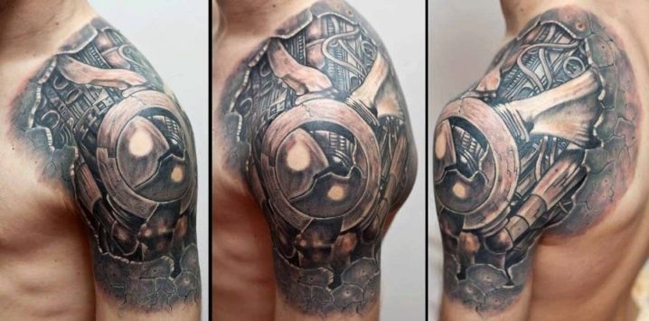 Ungewöhnliche Tattoos dieser Art im Stil der Biomechanik. Wenn Sie es wählen, können Sie ein Tattoo machen, das wie zerrissene Haut aussieht, durchscheinend durch Stahl.