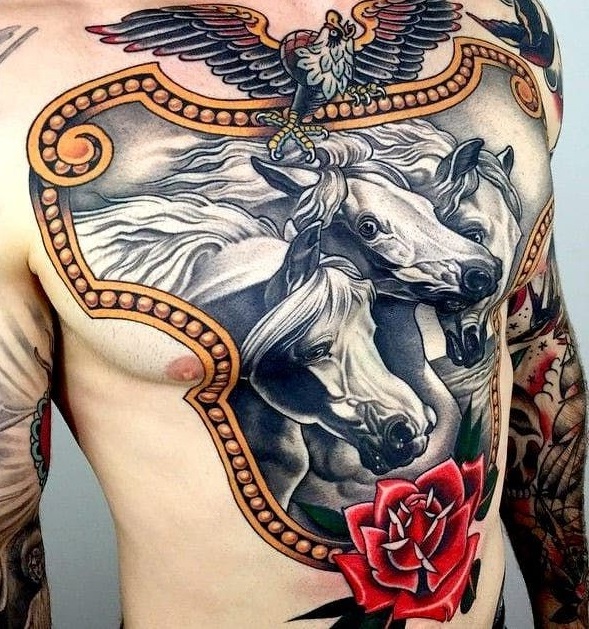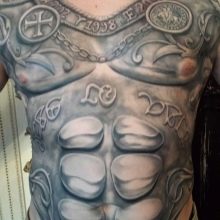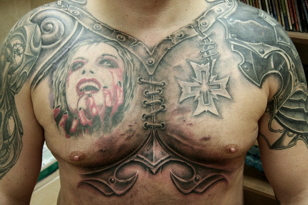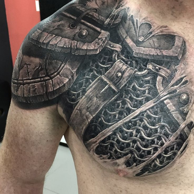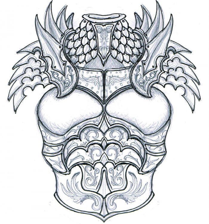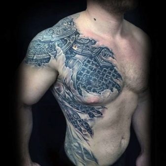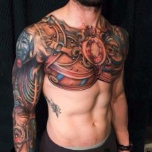 Bilder auf der Brust helfen, den Träger des Tattoos vor unnötigen Risiken und Gefahren zu schützen. Mit der richtigen Gestaltung der Details und der Verwendung der notwendigen Schattierungen können Sie eine Rüstung nahe am Original nachahmen.