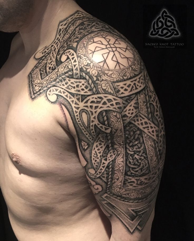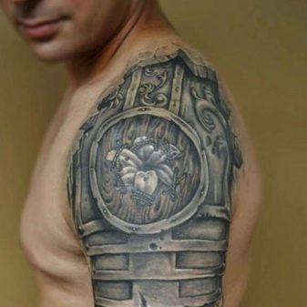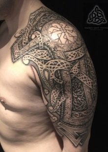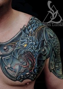 - Schulterpolster. Ein ähnliches Bild wird ausschließlich auf die Schulter aufgetragen. Solche Bilder können Stärke und Macht bedeuten. Seine Anwesenheit ermöglicht es Ihnen, die Männlichkeit des Besitzers, seine Zuverlässigkeit und seine Bereitschaft zu zeigen, um seine Schulter zu ersetzen.