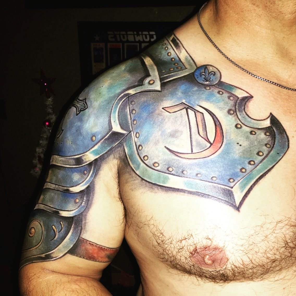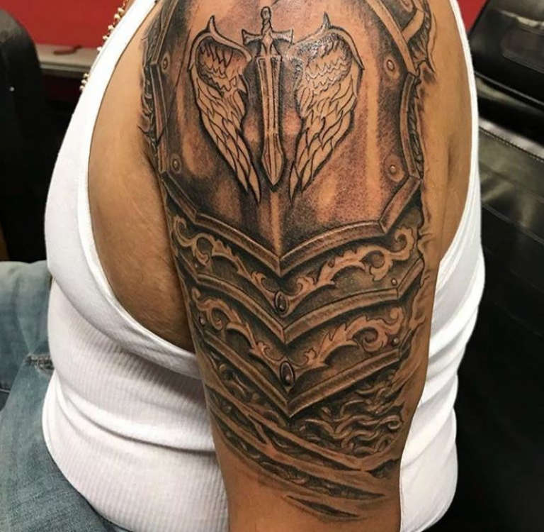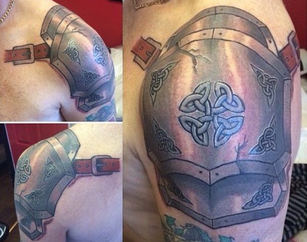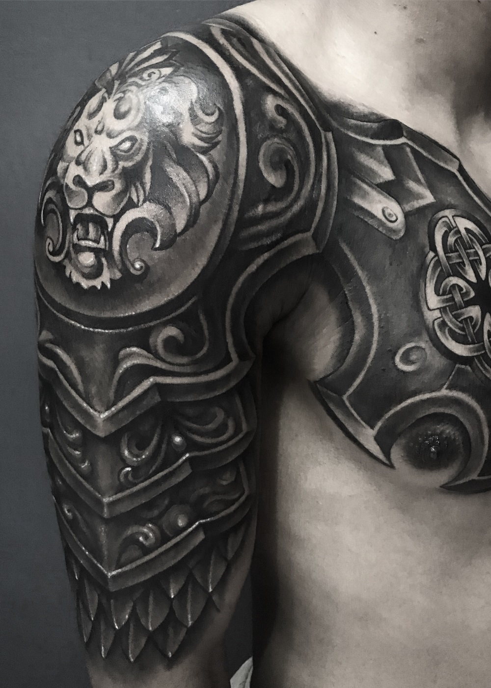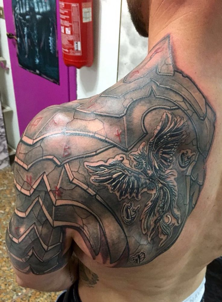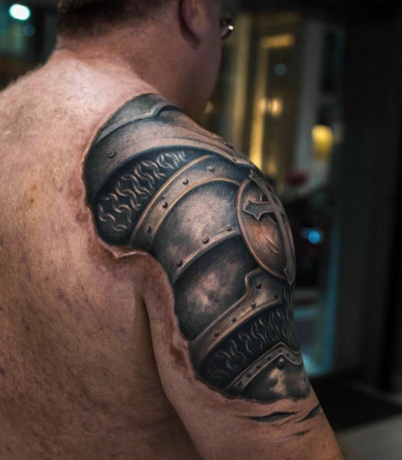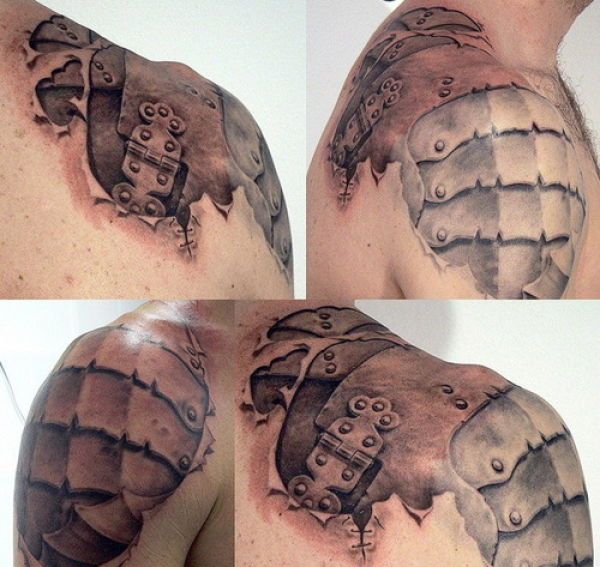 Separat platzierte Rüstungen auf den Schulterblättern sehen nicht organisch aus. Typischerweise sehen diese Tätowierungen wie eine Komposition aus, die von der Schulter ausgeht.