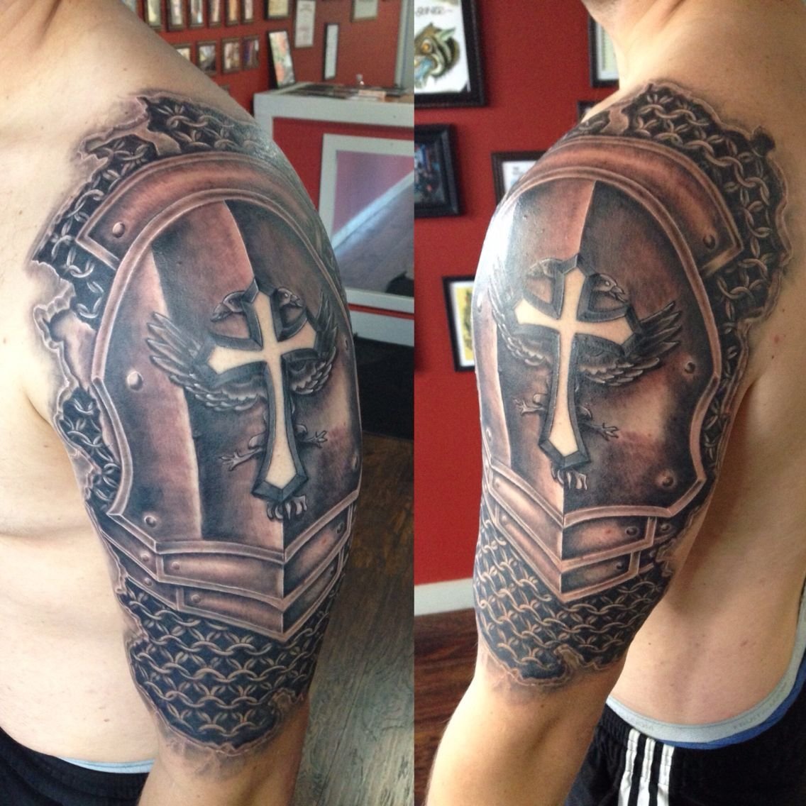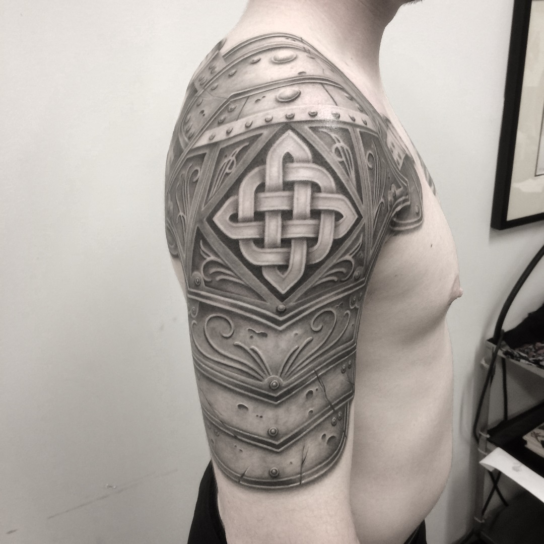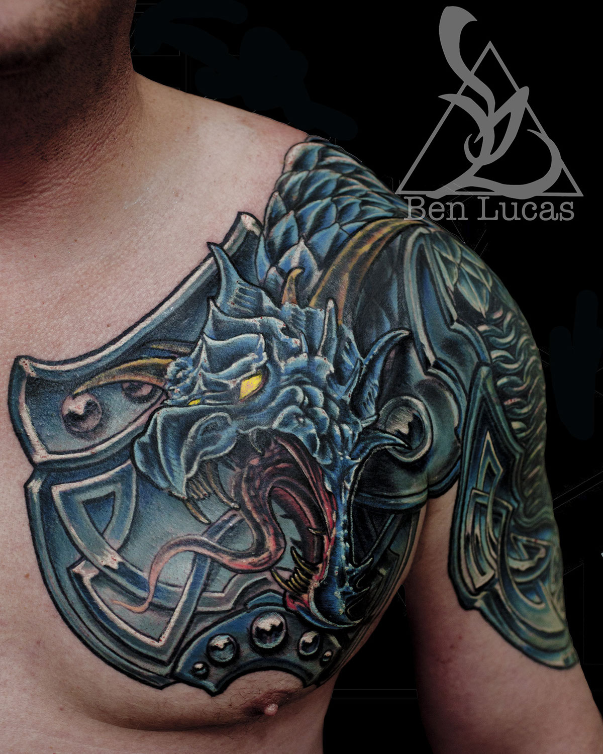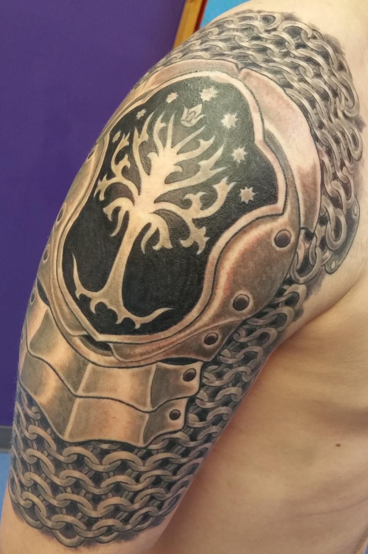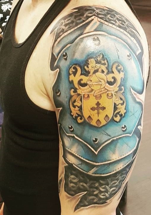 Separat platzierte Rüstungen auf den Schulterblättern sehen nicht organisch aus. Typischerweise sehen diese Tätowierungen wie eine Komposition aus, die von der Schulter ausgeht.