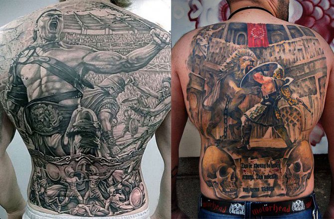 - Gladiatoren. Römische Soldaten mussten Schutzausrüstung tragen. Sie halfen ihnen im Kampf gegen den Feind. Gladiatorenkämpfe waren sehr spektakulär, das gilt auch für Tattoos zu diesem Thema. Ein Mann, der ein Bild mit Gladiatorenrüstung gewählt hat, wird oft durch bestimmte Umstände gefangen gehalten, genau wie die Zwangsgladiatoren, die um ihr Leben kämpften.