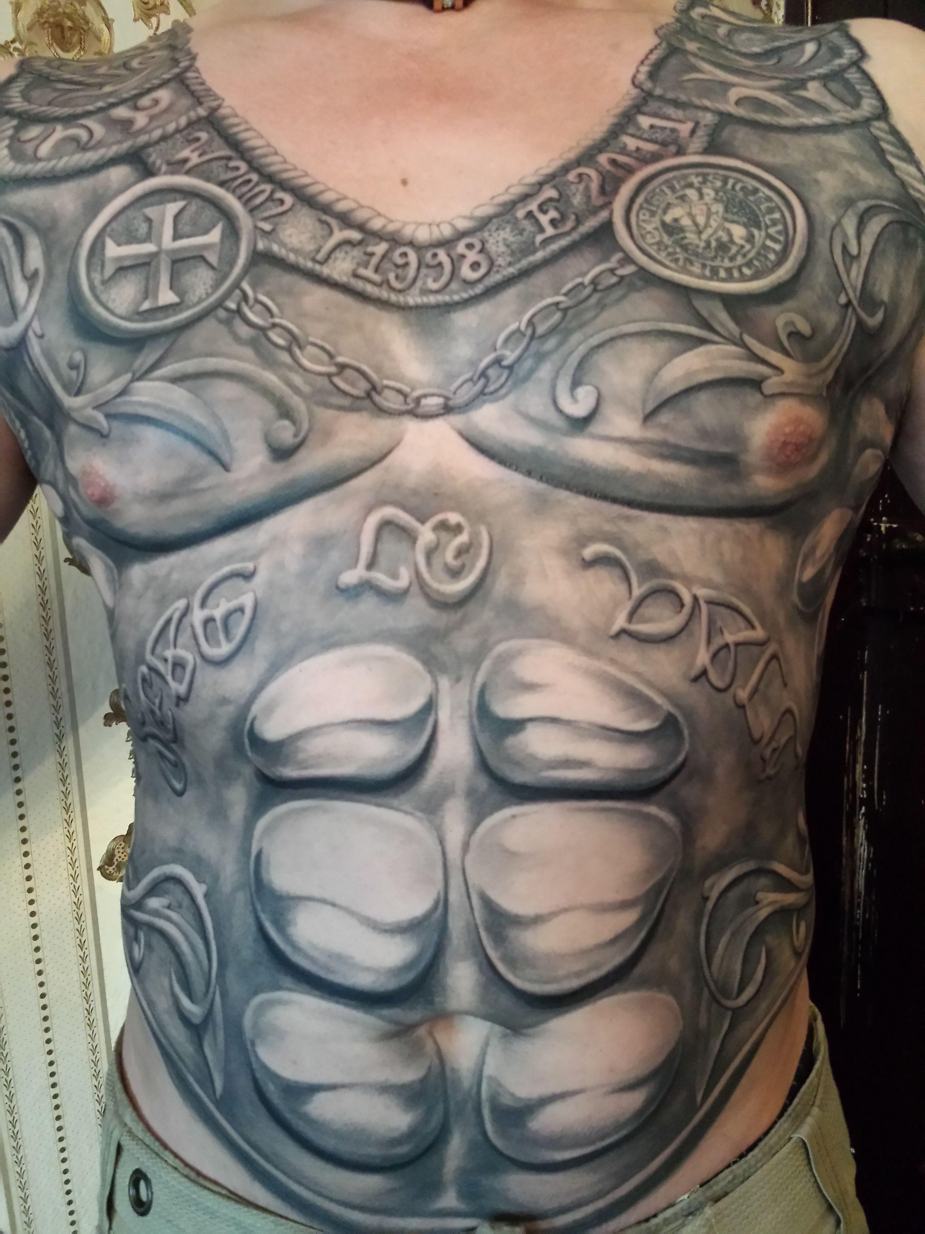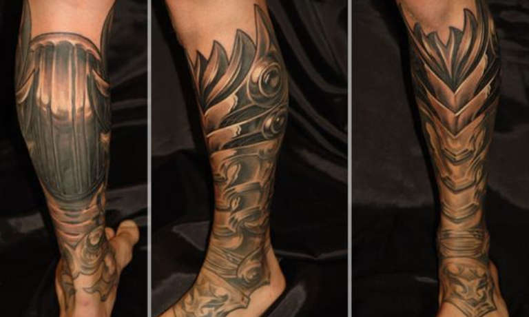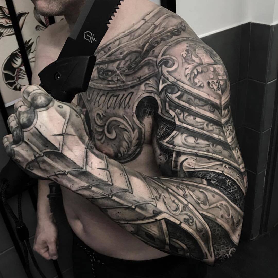 Rüstungs-Tattoos können wie eine echte Uniform aussehen oder Fantasy-Elemente, Details aus Science-Fiction, Cyber-Kleidung aufweisen.