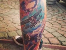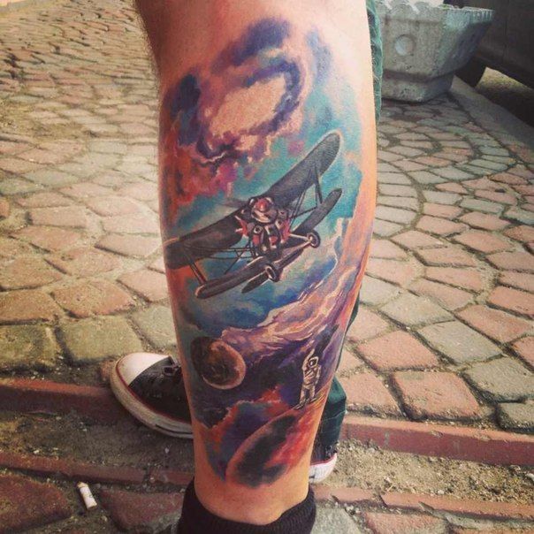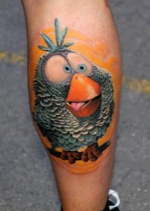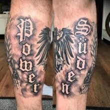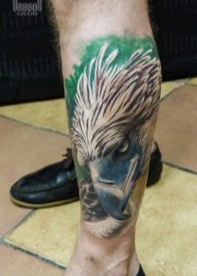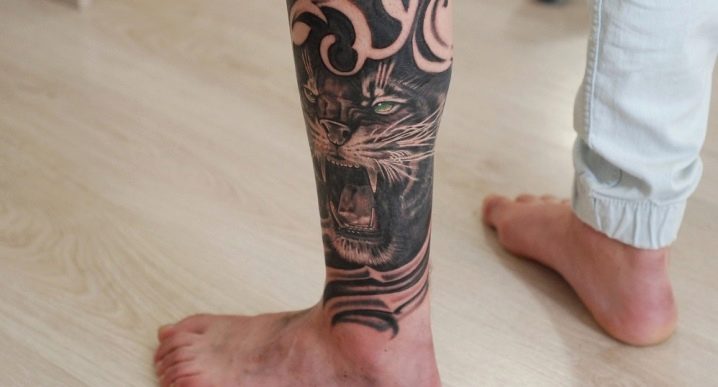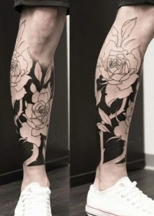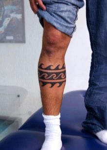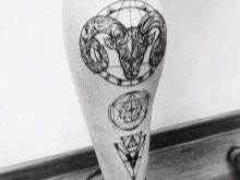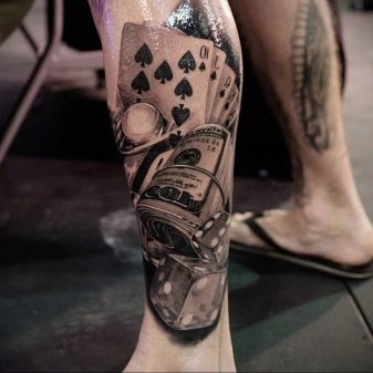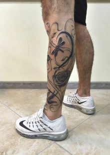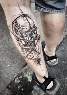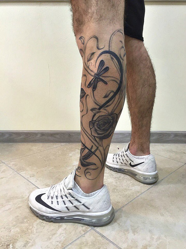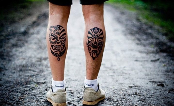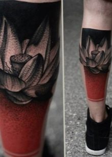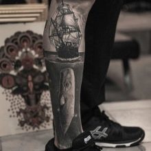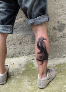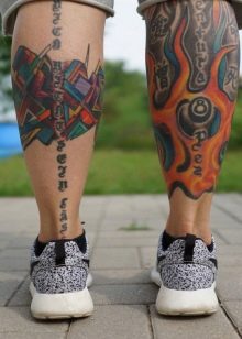Die Wadenmuskulatur gilt aufgrund ihrer passenden Größe und ausreichend Weichheit als idealer Ort zum Tätowieren. Deshalb bevorzugen die meisten Männer diesen speziellen Teil des Körpers. Im Wadenbereich befinden sich die Knochen relativ weit entfernt, sodass beim Auftragen einer Tätowierung die Schmerzen minimal sind. Der Ort ist ziemlich groß - Sie können nicht nur eine separate Zeichnung anwenden, sondern die gesamte Komposition ausfüllen.