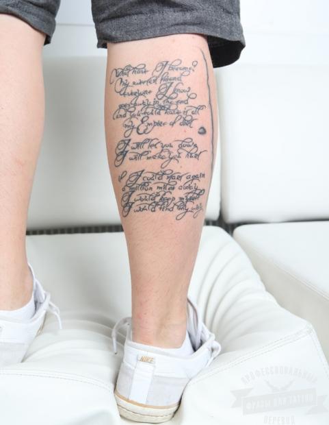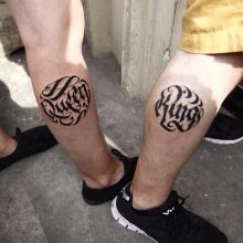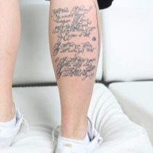 Lettering-Tattoos verlieren selten an Popularität. Varianten für die Wadenmuskulatur sind keine Ausnahme, weshalb viele Männer irgendeine Art von Text spritzen. Es kann individuell gestaltet oder mit einem Muster kombiniert werden.