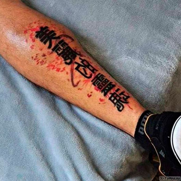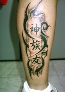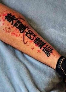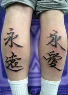 In der vorherigen Version wurden die Inschriften in Russisch, Englisch und anderen Sprachen berücksichtigt. Hieroglyphen gehören zu einer ganz anderen Kategorie, sie haben besondere Bedeutungen. Die häufigsten sind: Stärke, Ruhe, Glück, Glück, Loyalität, Reichtum, große Familie. Traditionell sind Hieroglyphen in Schwarz gehalten. Aber es gibt auch andere (künstlerische und farbenfrohe) Optionen.
